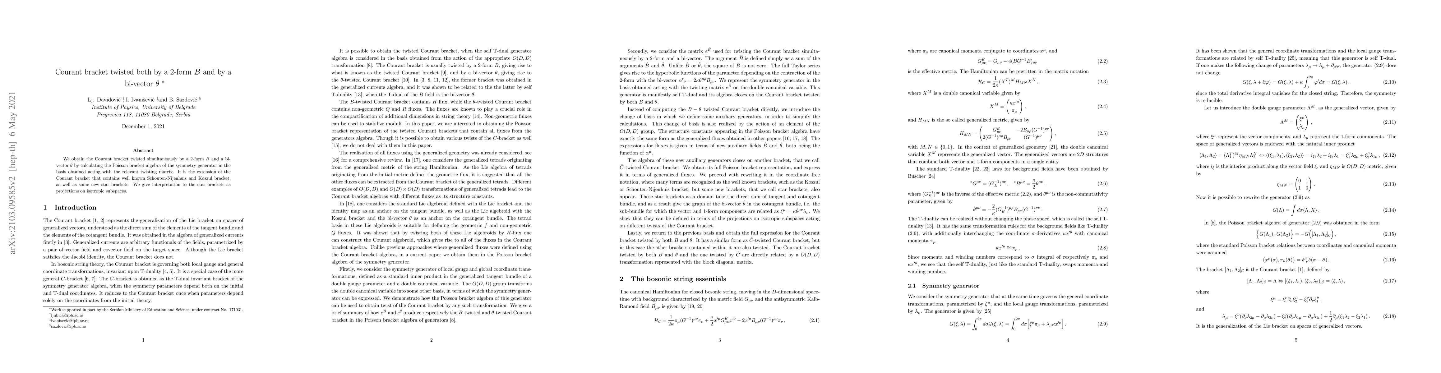 We obtain the Courant bracket twisted simultaneously by a 2-form $B$ and a bi-vector $\theta$ by calculating the Poisson bracket algebra of the symmetry generator in the basis obtained acting with the relevant twisting matrix. It is the extension of the Courant bracket that contains well known Schouten-Nijenhuis and Koszul bracket, as well as some new star brackets. We give interpretation to the star brackets as projections on isotropic subspaces.