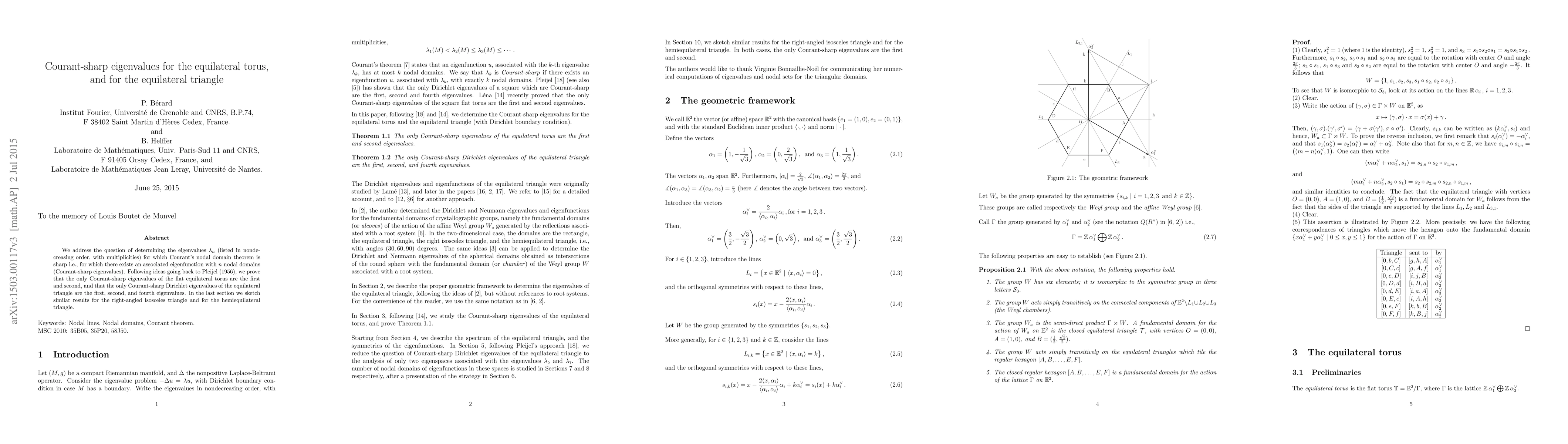 This paper determines the Courant-sharp eigenvalues for the equilateral torus and triangle, proving that the first and second eigenvalues for the torus, and the first, second, and fourth for the triangle, are the only ones that satisfy Courant's nodal domain theorem. Similar results are briefly outlined for the right-angled isosceles and hemiequilateral triangles.