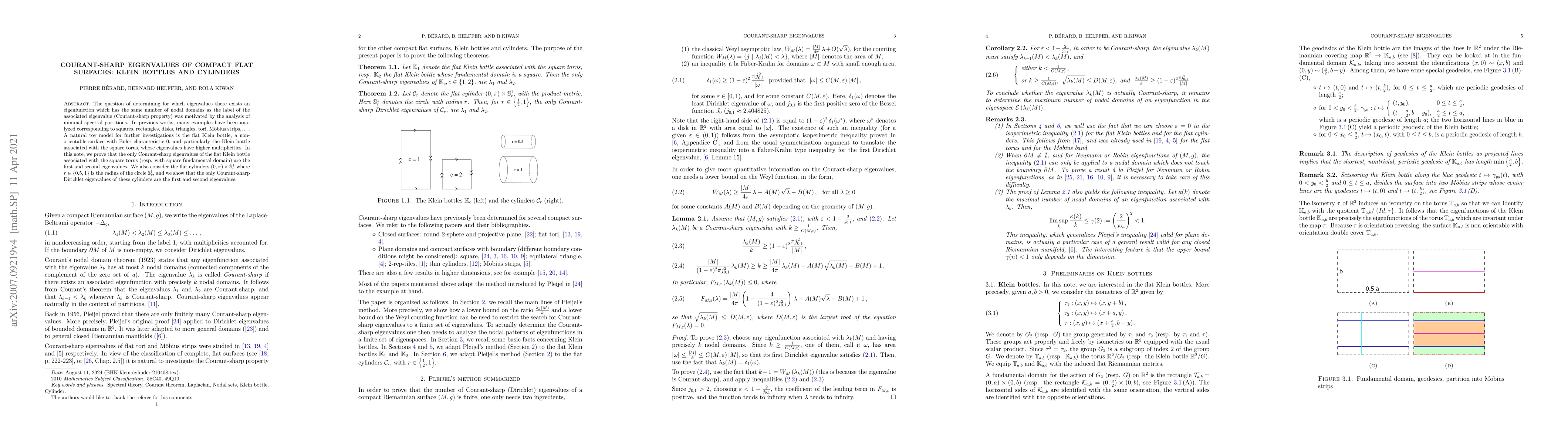 This paper investigates the Courant-sharp eigenvalues on flat Klein bottles and cylinders, proving that the first and second eigenvalues are the only ones exhibiting the Courant-sharp property, where eigenfunctions have the same number of nodal domains as their eigenvalue labels. This extends previous studies on various geometric shapes.