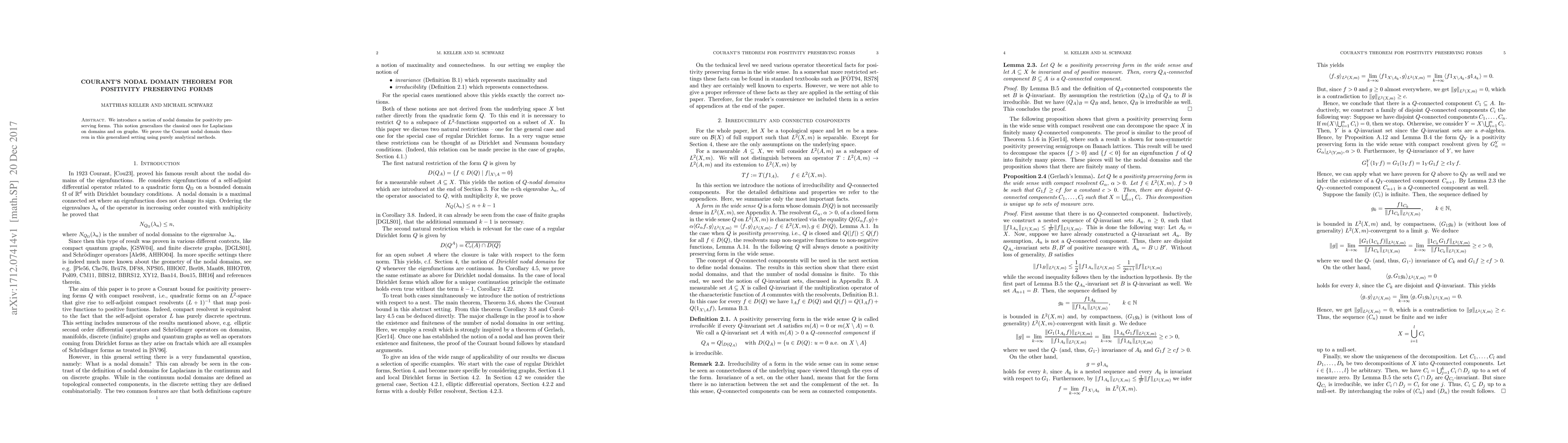 This paper generalizes Courant's nodal domain theorem to positivity preserving forms, extending the classical notion from Laplacians on domains and graphs. The authors prove the theorem using purely analytical methods.
