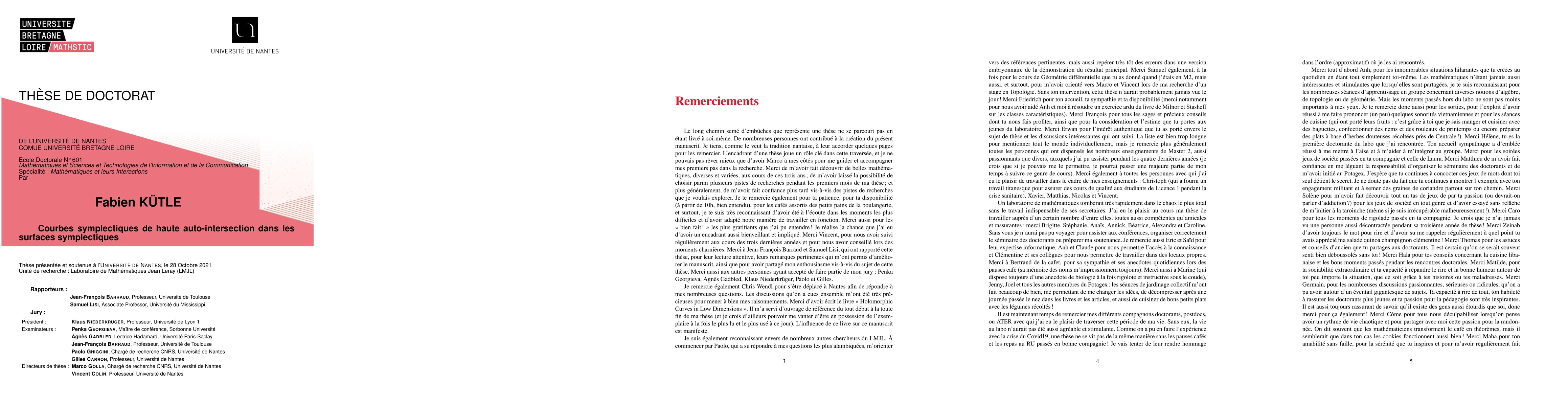 We first study symplectically embedded curves in symplectic surfaces with high self-intersection numbers compared to their genus. We prove in two different ways that such a curve completely determines both the diffeomorphism type of the surface in which it is embedded and the embedding itself. The first proof uses Seiberg-Witten theory whereas the second one only involves pseudoholomorphic techniques. We deduce from this result that the contact $3$-manifolds naturally associated with those curves admit a unique strong symplectic filling up to diffeomorphism. We next examine symplectic sections of geometrically ruled complex surfaces over elliptic curves. We show that such a section is symplectically isotopic to a complex section. -- On \'etudie dans un premier temps les courbes symplectiquement plong\'ees dans les surfaces symplectiques dont les nombres d'auto-intersection sont suffisamment grands par rapport leurs genres. On montre de deux mani\`eres diff\'erentes qu'une telle courbe d\'etermine \`a la fois la classe de diff\'eomorphisme de la surface symplectique qui la contient et la mani\`ere dont elle est plong\'ee dans cette surface. La premi\`ere d\'emonstration fait appel \`a la th\'eorie de Seiberg-Witten, alors que la seconde se restreint aux techniques pseudoholomorphes. On d\'eduit de ce r\'esultat l'unicit\'e \`a diff\'eomorphisme pr\`es des remplissages symplectiques forts des vari\'et\'es de contact de dimension $3$ naturellement associ\'ees \`a ce type de courbes. Dans un second temps, on s'int\'eresse aux sections symplectiques des surfaces complexes g\'eom\'etriquement r\'egl\'ees au-dessus de courbes elliptiques. On montre qu'une telle section est symplectiquement isotope \`a une section complexe.