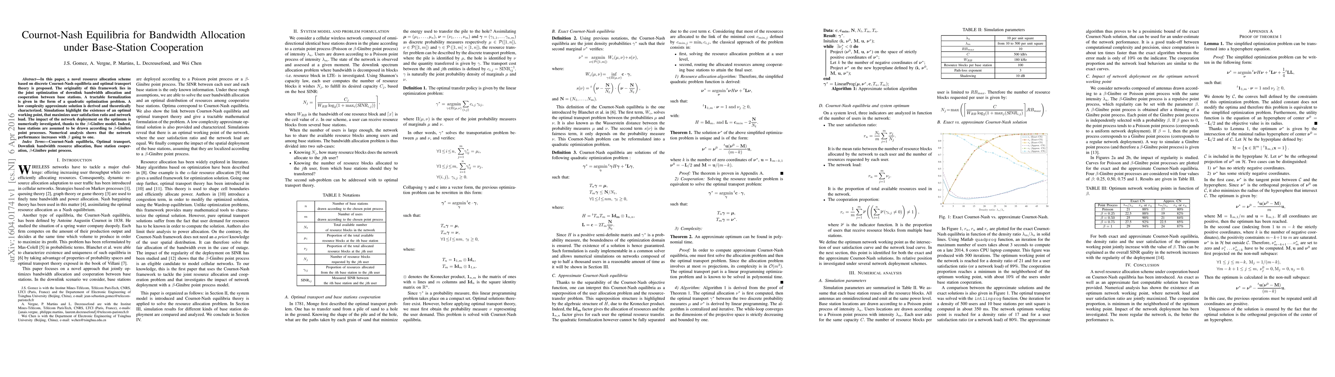 -In this paper, a novel resource allocation scheme based on discrete Cournot-Nash equilibria and optimal transport theory is proposed. The originality of this framework lies in the joint optimization of downlink bandwidth allocation and cooperation between base stations. A tractable formalization is given in the form of a quadratic optimization problem. A low complexity approximate solution is derived and theoretically characterized. Simulations highlight the existence of an optimal working point, that maximizes user satisfaction ratio and network load. The impact of the network deployment on the optimum is numerically investigated, thanks to the $\beta$-Ginibre model. Indeed, base stations are assumed to be drawn according to $\beta$-Ginibre point processes. Numerical analysis shows that the network performance increases with $\beta$ going to one.