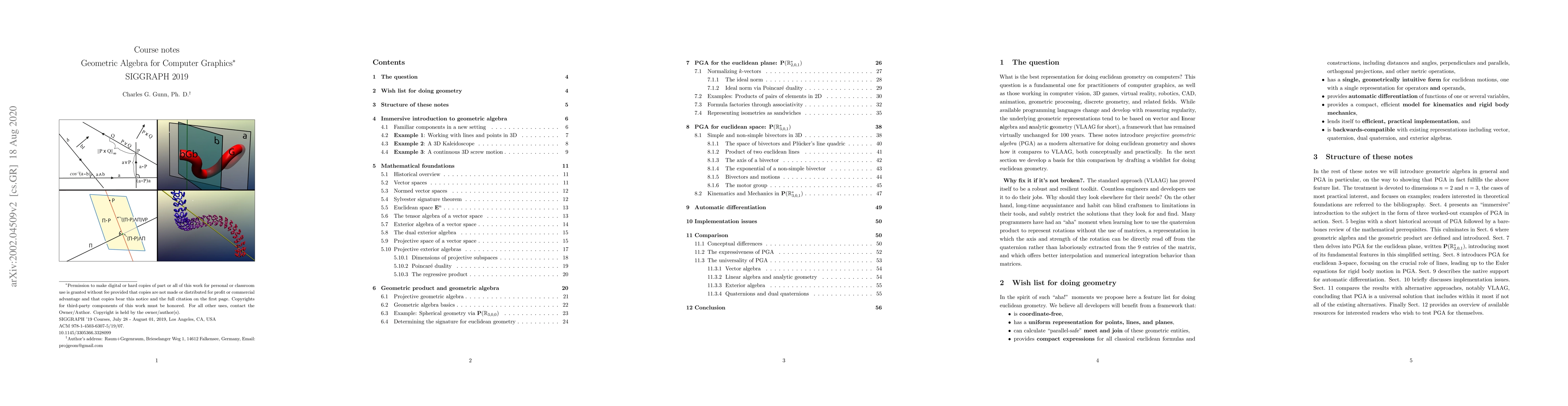 What is the best representation for doing euclidean geometry on computers? These notes from a SIGGRAPH 2019 short course entitled "Geometric algebra for computer graphics" introduce projective geometric algebra (PGA) as a modern framework for this task. PGA features: uniform representation of points, lines, and planes; robust, parallel-safe join and meet operations; compact, polymorphic syntax for euclidean formulas and constructions; a single intuitive sandwich form for isometries; native support for automatic differentiation; and tight integration of kinematics and rigid body mechanics. PGA includes vector, quaternion, dual quaternion, and exterior algebras as sub-algebras, simplifying the learning curve and transition path for experienced practitioners. On the practical side, it can be efficiently implemented, while its rich syntax enhances programming productivity. The basic ideas are introduced in the 2D context and developed selectively for 3D. Advantages to traditional approaches are collected in a table at the end. The article aims to be a self-contained introduction for practitioners of euclidean geometry and includes numerous examples, formulas, figures, and tables.