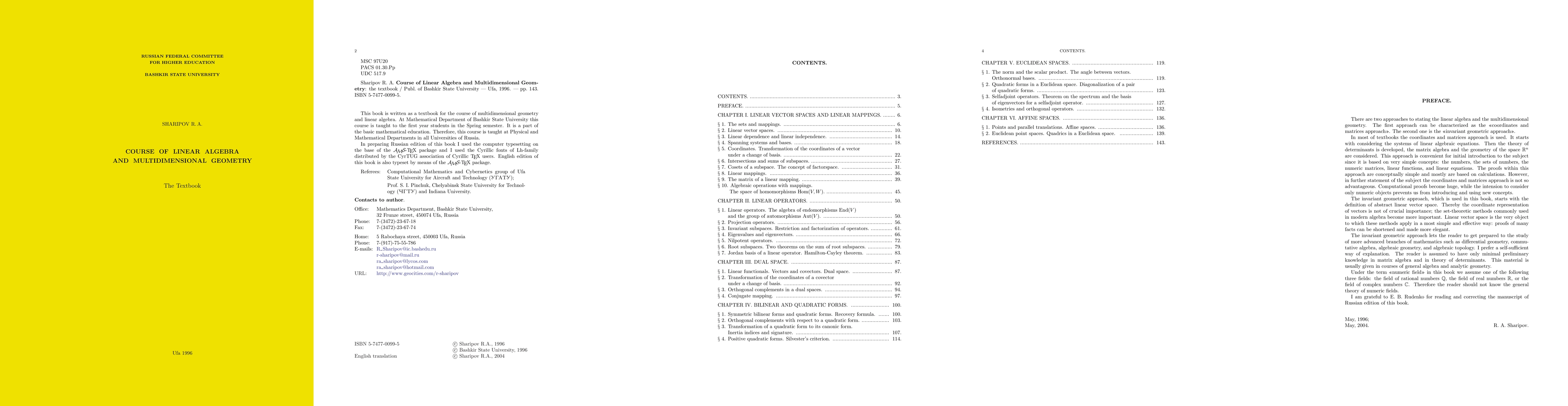 This is a standard textbook for the course of linear algebra and multidimensional geometry as it was taught in 1991-1998 at Mathematical Department of Bashkir State University. Both coordinate and invariant approaches are used, but invariant approach is preferred.