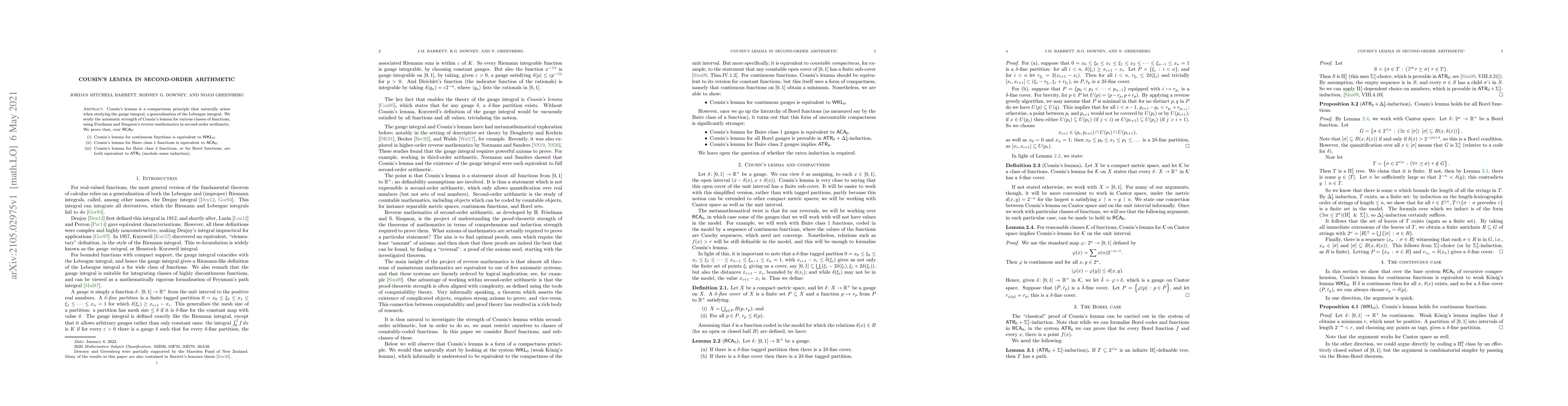 The paper explores Cousin's lemma in second-order arithmetic, showing its equivalence to various weak systems of arithmetic, including WKL0, ACA0, and ATR0, for different classes of functions.