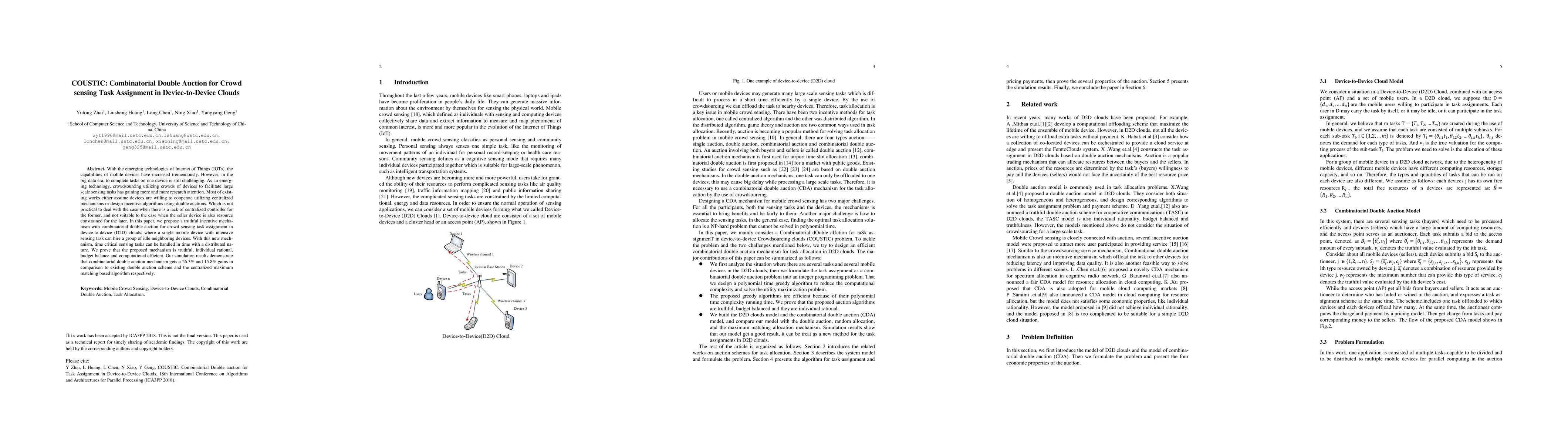 This paper proposes a combinatorial double auction mechanism named COUSTIC for task assignment in device-to-device clouds, enabling a single mobile device to hire idle neighboring devices for large-scale sensing tasks. The proposed mechanism is proven to be truthful, individually rational, budget balanced, and computationally efficient, achieving significant improvements over existing methods.