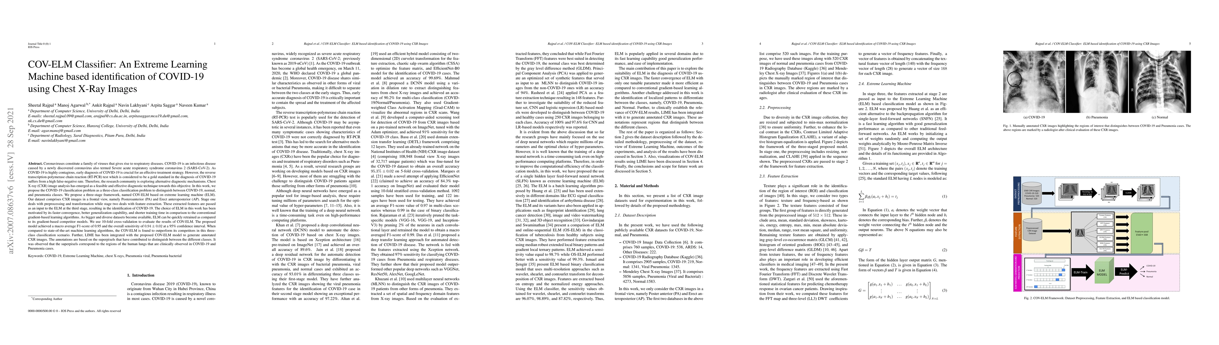 Coronaviruses constitute a family of viruses that gives rise to respiratory diseases. As COVID-19 is highly contagious, early diagnosis of COVID-19 is crucial for an effective treatment strategy. However, the RT-PCR test which is considered to be a gold standard in the diagnosis of COVID-19 suffers from a high false-negative rate. Chest X-ray (CXR) image analysis has emerged as a feasible and effective diagnostic technique towards this objective. In this work, we propose the COVID-19 classification problem as a three-class classification problem to distinguish between COVID-19, normal, and pneumonia classes. We propose a three-stage framework, named COV-ELM. Stage one deals with preprocessing and transformation while stage two deals with feature extraction. These extracted features are passed as an input to the ELM at the third stage, resulting in the identification of COVID-19. The choice of ELM in this work has been motivated by its faster convergence, better generalization capability, and shorter training time in comparison to the conventional gradient-based learning algorithms. As bigger and diverse datasets become available, ELM can be quickly retrained as compared to its gradient-based competitor models. The proposed model achieved a macro average F1-score of 0.95 and the overall sensitivity of ${0.94 \pm 0.02} at a 95% confidence interval. When compared to state-of-the-art machine learning algorithms, the COV-ELM is found to outperform its competitors in this three-class classification scenario. Further, LIME has been integrated with the proposed COV-ELM model to generate annotated CXR images. The annotations are based on the superpixels that have contributed to distinguish between the different classes. It was observed that the superpixels correspond to the regions of the human lungs that are clinically observed in COVID-19 and Pneumonia cases.