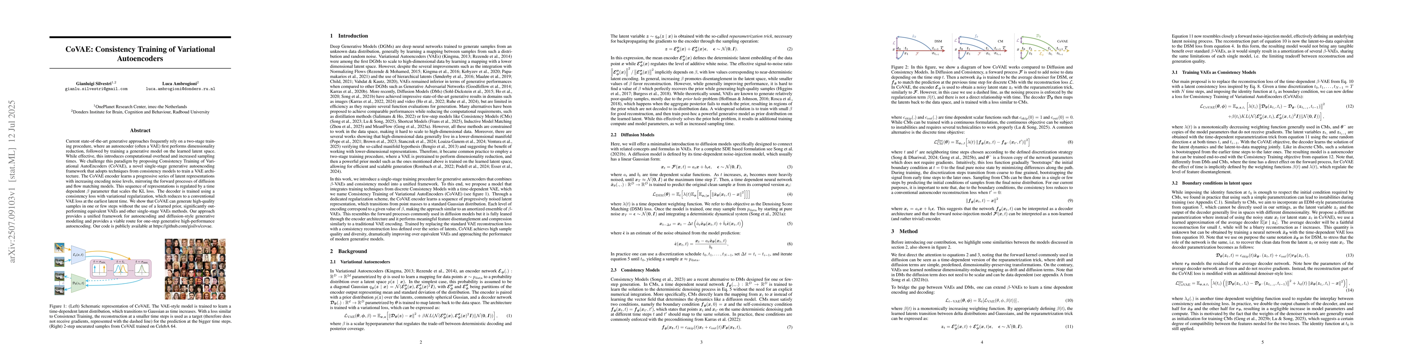 Current state-of-the-art generative approaches frequently rely on a two-stage training procedure, where an autoencoder (often a VAE) first performs dimensionality reduction, followed by training a generative model on the learned latent space. While effective, this introduces computational overhead and increased sampling times. We challenge this paradigm by proposing Consistency Training of Variational AutoEncoders (CoVAE), a novel single-stage generative autoencoding framework that adopts techniques from consistency models to train a VAE architecture. The CoVAE encoder learns a progressive series of latent representations with increasing encoding noise levels, mirroring the forward processes of diffusion and flow matching models. This sequence of representations is regulated by a time dependent $\beta$ parameter that scales the KL loss. The decoder is trained using a consistency loss with variational regularization, which reduces to a conventional VAE loss at the earliest latent time. We show that CoVAE can generate high-quality samples in one or few steps without the use of a learned prior, significantly outperforming equivalent VAEs and other single-stage VAEs methods. Our approach provides a unified framework for autoencoding and diffusion-style generative modeling and provides a viable route for one-step generative high-performance autoencoding. Our code is publicly available at https://github.com/gisilvs/covae.
