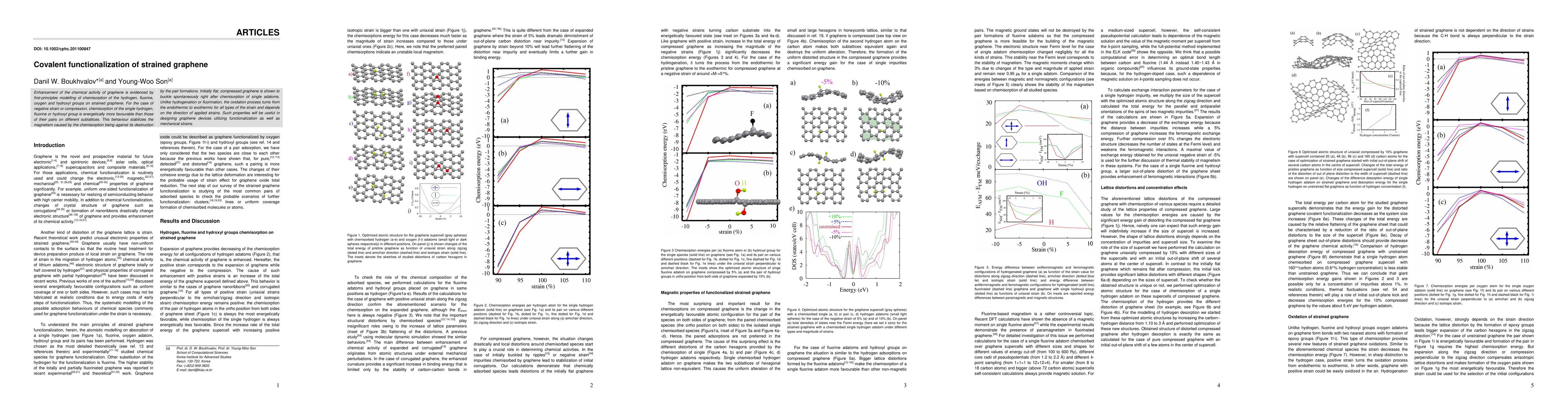 This paper explores the enhancement of graphene's chemical activity via first-principles modelling of hydrogen, fluorine, oxygen, and hydroxyl group chemisorption on strained graphene, revealing that single adatom chemisorption under negative strain favors magnetism stabilization. The oxidation process becomes exothermic under all strain types, suggesting practical applications in functionalized graphene devices.