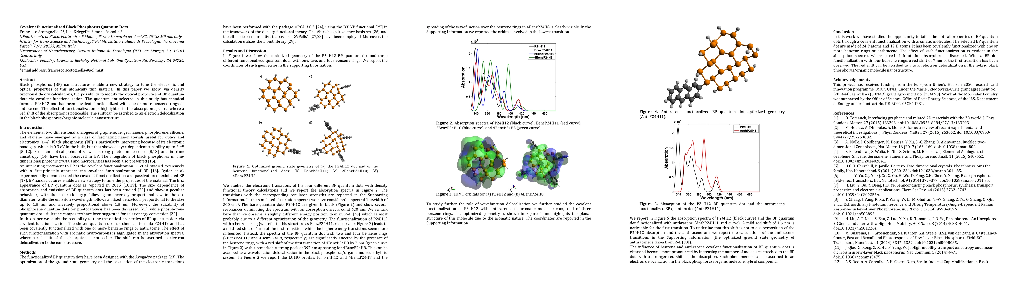 Summary: This study demonstrates that covalent functionalization of black phosphorus quantum dots, specifically P24H12, with benzene rings or anthracene can modify their optical properties, evidenced by a red shift in absorption spectra due to electron delocalization. Density functional theory calculations support these findings.