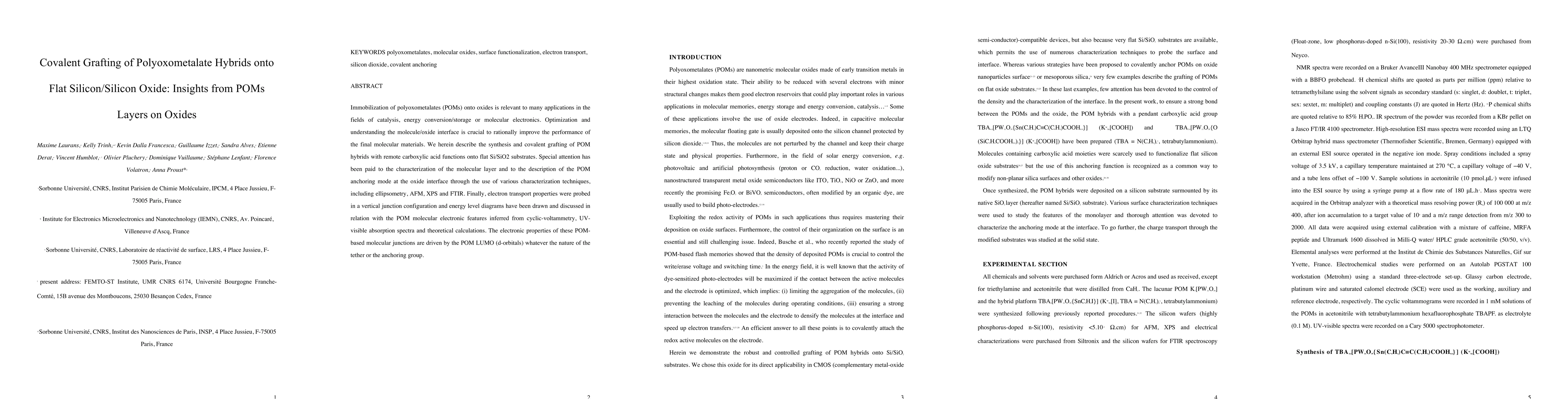 Immobilization of polyoxometalates (POMs) onto oxides is relevant to many applications in the fields of catalysis, energy conversion/storage or molecular electronics. Optimization and understanding the molecule/oxide interface is crucial to rationally improve the performance of the final molecular materials. We herein describe the synthesis and covalent grafting of POM hybrids with remote carboxylic acid functions onto flat Si/SiO2 substrates. Special attention has been paid to the characterization of the molecular layer and to the description of the POM anchoring mode at the oxide interface through the use of various characterization techniques, including ellipsometry, AFM, XPS and FTIR. Finally, electron transport properties were probed in a vertical junction configuration and energy level diagrams have been drawn and discussed in relation with the POM molecular electronic features inferred from cyclic-voltammetry, UV-visible absorption spectra and theoretical calculations. The electronic properties of these POM-based molecular junctions are driven by the POM LUMO (d-orbitals) whatever the nature of the tether or the anchoring group.