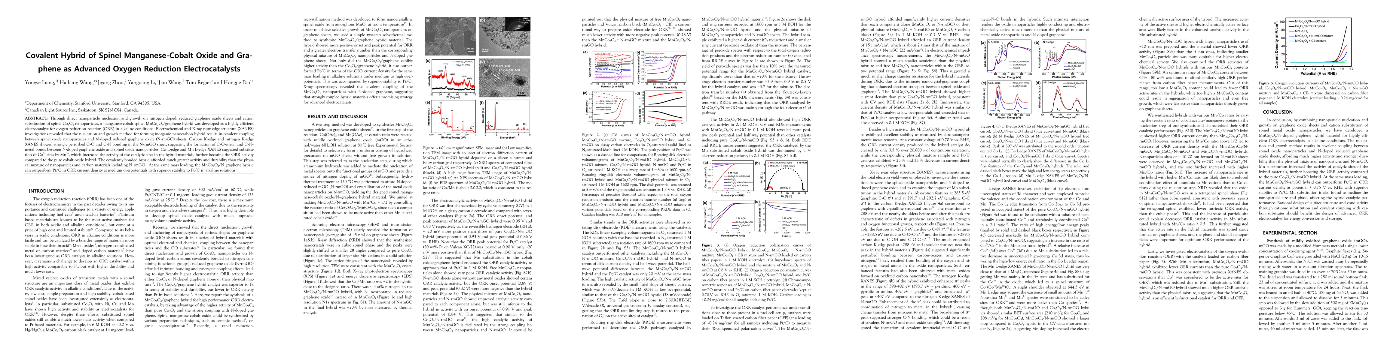 A covalent hybrid of spinel manganese-cobalt oxide and graphene was developed as an advanced electrocatalyst for oxygen reduction reaction (ORR) in alkaline conditions, showing superior activity and durability compared to Pt/C. The hybrid's enhanced performance is attributed to the covalent bonding between spinel oxide nanoparticles and nitrogen-doped graphene, which boosts catalytic site activity and stability.