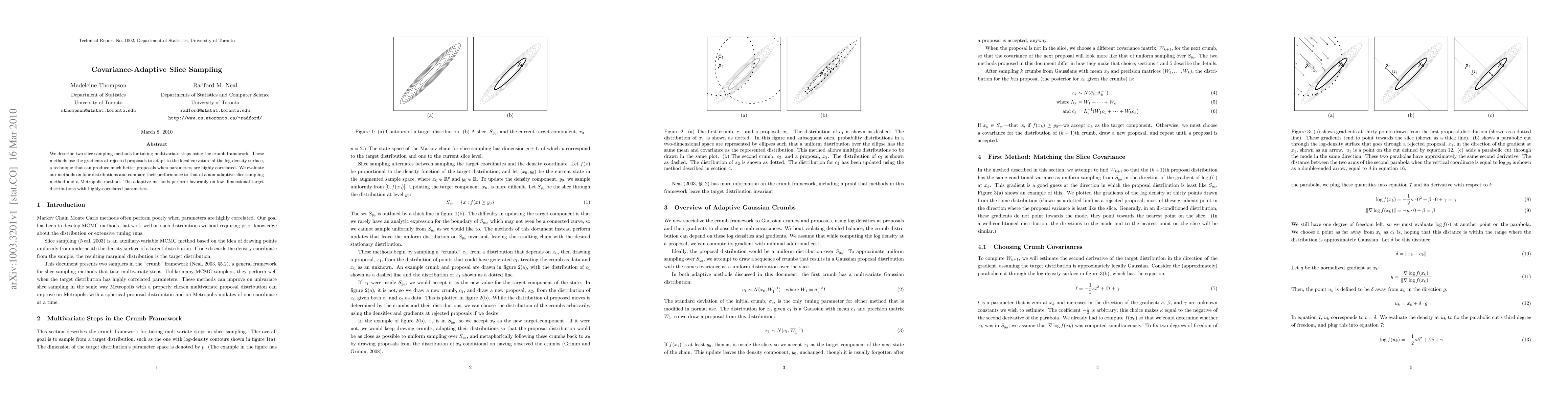 Summary: This paper introduces covariance-adaptive slice sampling methods that utilize gradient information from rejected proposals to adapt to the local curvature of the log-density surface, improving the efficiency of multivariate sampling, especially for distributions with highly correlated parameters. The adaptive methods show superior performance compared to non-adaptive slice sampling and Metropolis methods.
