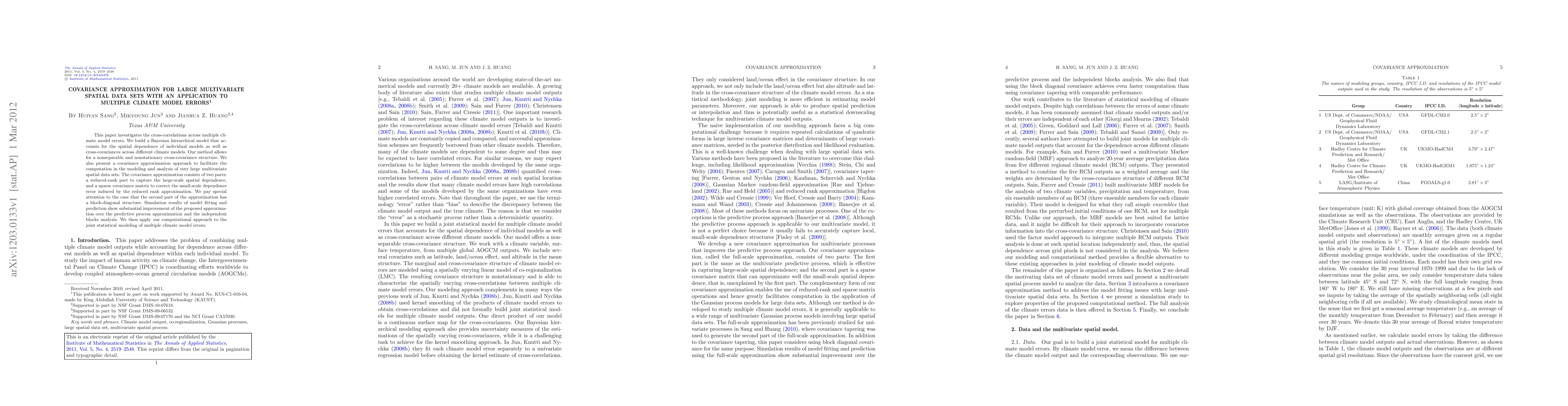 This paper investigates the cross-correlations across multiple climate model errors. We build a Bayesian hierarchical model that accounts for the spatial dependence of individual models as well as cross-covariances across different climate models. Our method allows for a nonseparable and nonstationary cross-covariance structure. We also present a covariance approximation approach to facilitate the computation in the modeling and analysis of very large multivariate spatial data sets. The covariance approximation consists of two parts: a reduced-rank part to capture the large-scale spatial dependence, and a sparse covariance matrix to correct the small-scale dependence error induced by the reduced rank approximation. We pay special attention to the case that the second part of the approximation has a block-diagonal structure. Simulation results of model fitting and prediction show substantial improvement of the proposed approximation over the predictive process approximation and the independent blocks analysis. We then apply our computational approach to the joint statistical modeling of multiple climate model errors.