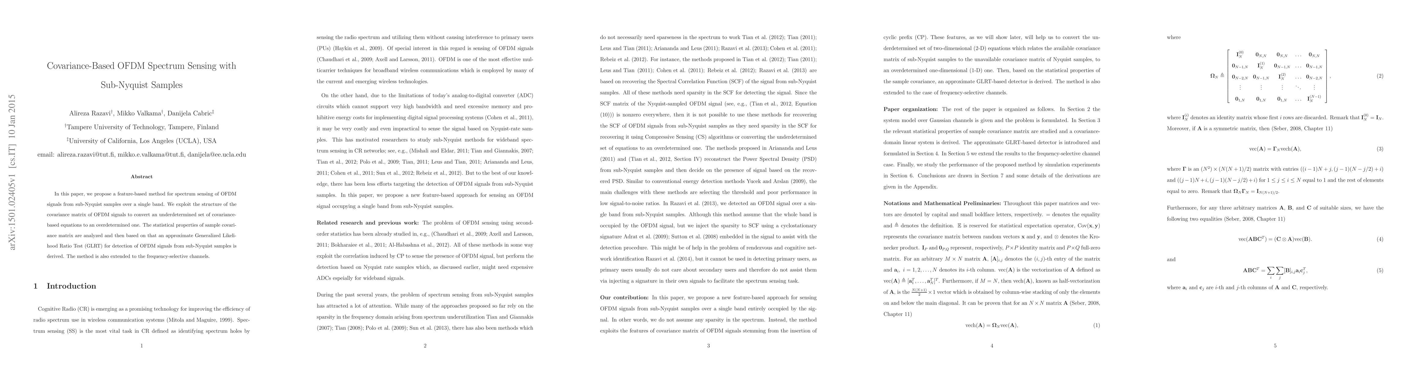 This paper proposes a feature-based method for spectrum sensing of OFDM signals using sub-Nyquist samples, leveraging the covariance matrix structure to convert underdetermined equations to overdetermined ones. An approximate Generalized Likelihood Ratio Test (GLRT) is derived for detecting OFDM signals, and the method is extended for frequency-selective channels.