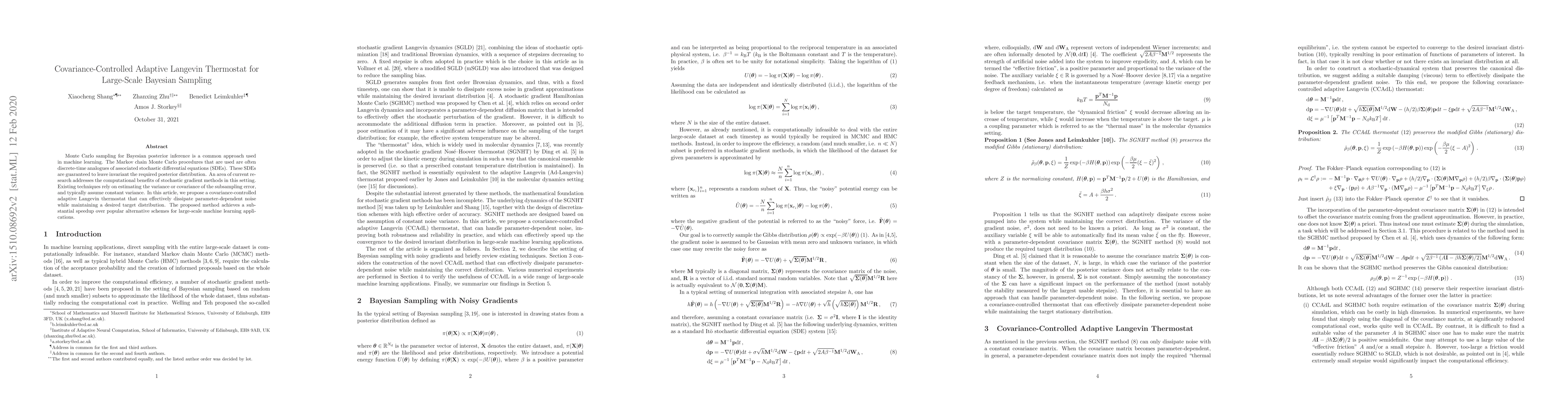 The paper introduces a covariance-controlled adaptive Langevin thermostat for efficient large-scale Bayesian sampling. This method effectively dissipates parameter-dependent noise while preserving the target distribution, outperforming existing techniques in speed for machine learning applications.