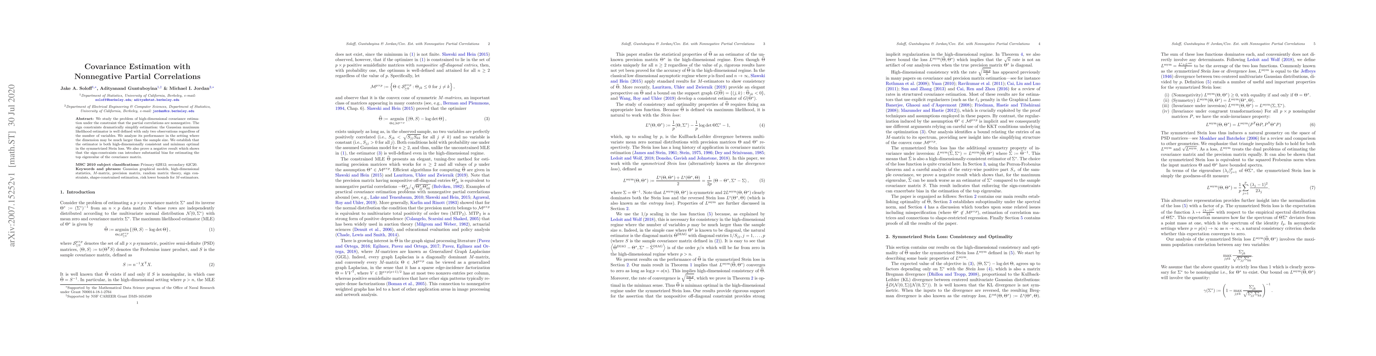 This paper studies the estimation of high-dimensional covariance matrices with nonnegative partial correlations, finding that a simple Gaussian estimator is highly consistent and minimax optimal, but can introduce bias when estimating top eigenvalues.