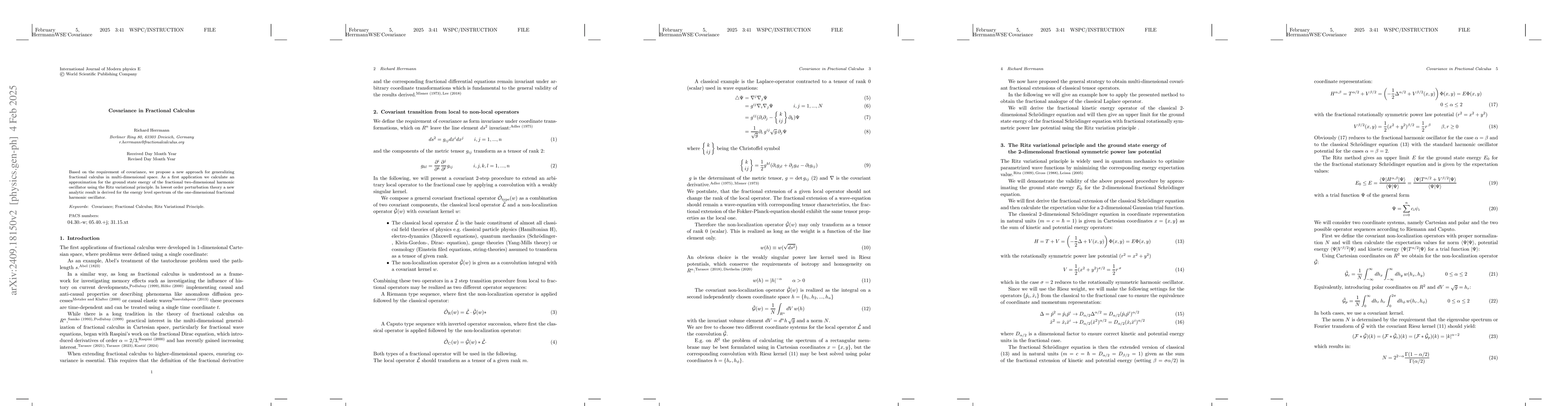 This paper introduces a novel method for extending fractional calculus to multi-dimensional spaces with a focus on covariance. It applies this new approach to approximate the ground state energy of a fractional 2-dimensional harmonic oscillator using the Ritz variational principle.