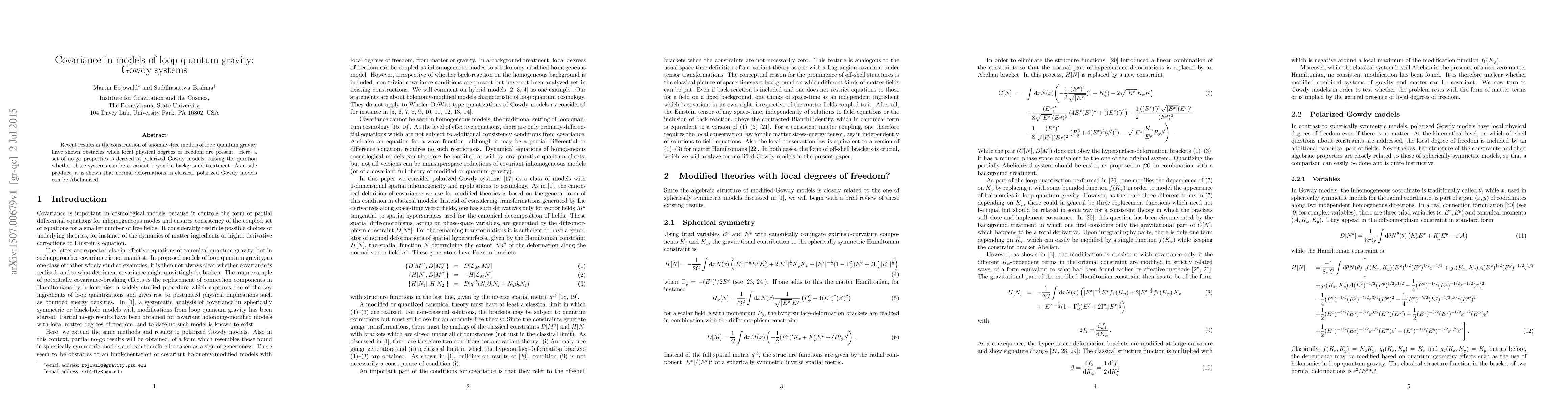This paper explores the challenges in constructing anomaly-free models of loop quantum gravity, particularly in polarized Gowdy systems, revealing no-go properties that question their covariant treatment beyond background. Additionally, it demonstrates that normal deformations in classical polarized Gowdy models can be Abelianized.