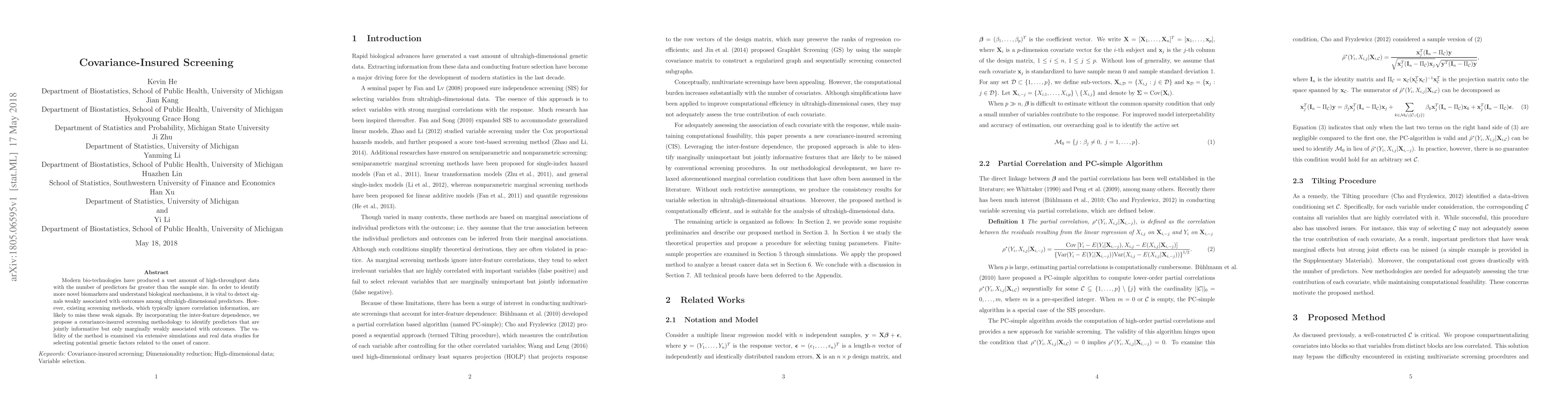 Modern bio-technologies have produced a vast amount of high-throughput data with the number of predictors far greater than the sample size. In order to identify more novel biomarkers and understand biological mechanisms, it is vital to detect signals weakly associated with outcomes among ultrahigh-dimensional predictors. However, existing screening methods, which typically ignore correlation information, are likely to miss these weak signals. By incorporating the inter-feature dependence, we propose a covariance-insured screening methodology to identify predictors that are jointly informative but only marginally weakly associated with outcomes. The validity of the method is examined via extensive simulations and real data studies for selecting potential genetic factors related to the onset of cancer.