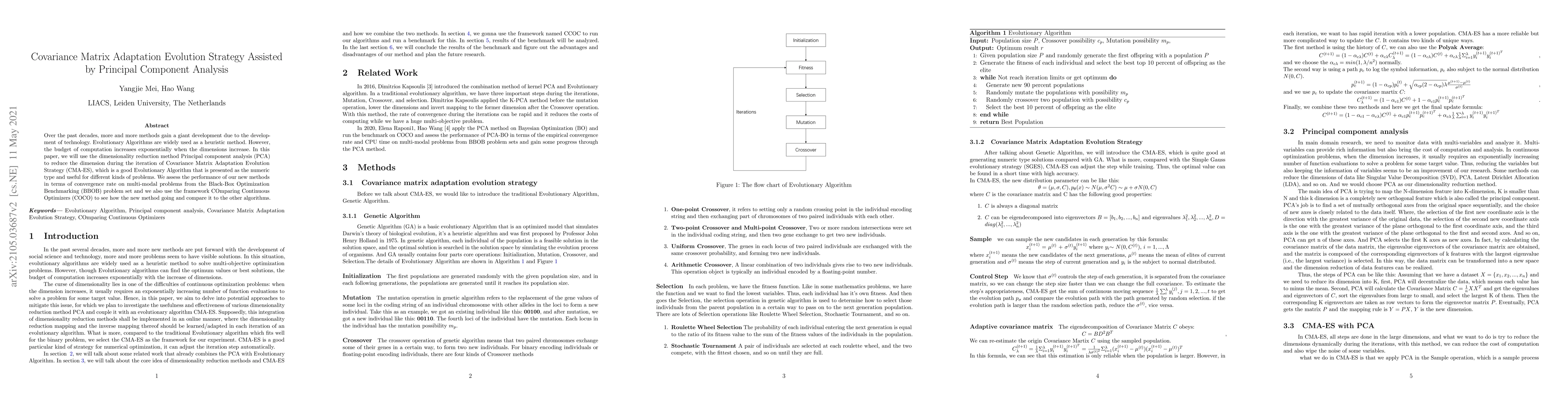 This paper proposes integrating Principal Component Analysis (PCA) with the Covariance Matrix Adaptation Evolution Strategy (CMA-ES) to reduce dimensionality and computational cost during optimization. The performance of the new method is evaluated on multi-modal problems using the BBOB benchmark and COCO framework, showing improved convergence rates.