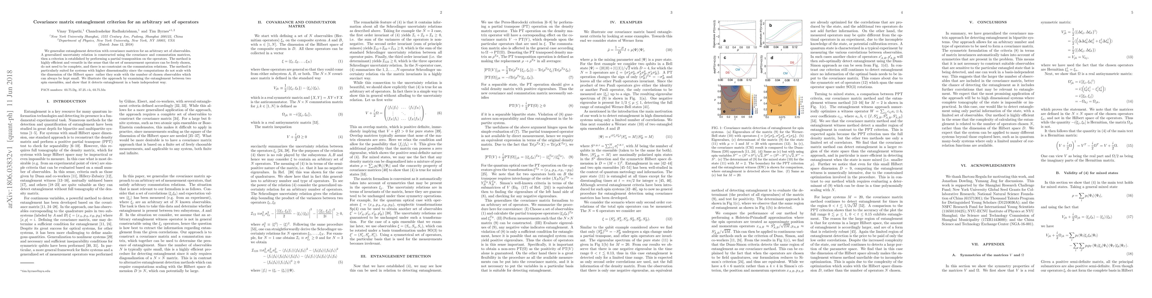 This paper proposes a new entanglement detection method using covariance matrices for any set of observables, establishing a generalized uncertainty relation and a criterion via partial transposition. The method is efficient and adaptable, scaling with the number of observables rather than the system's dimensionality, and successfully detects entanglement in spin ensembles in a basis-independent manner.