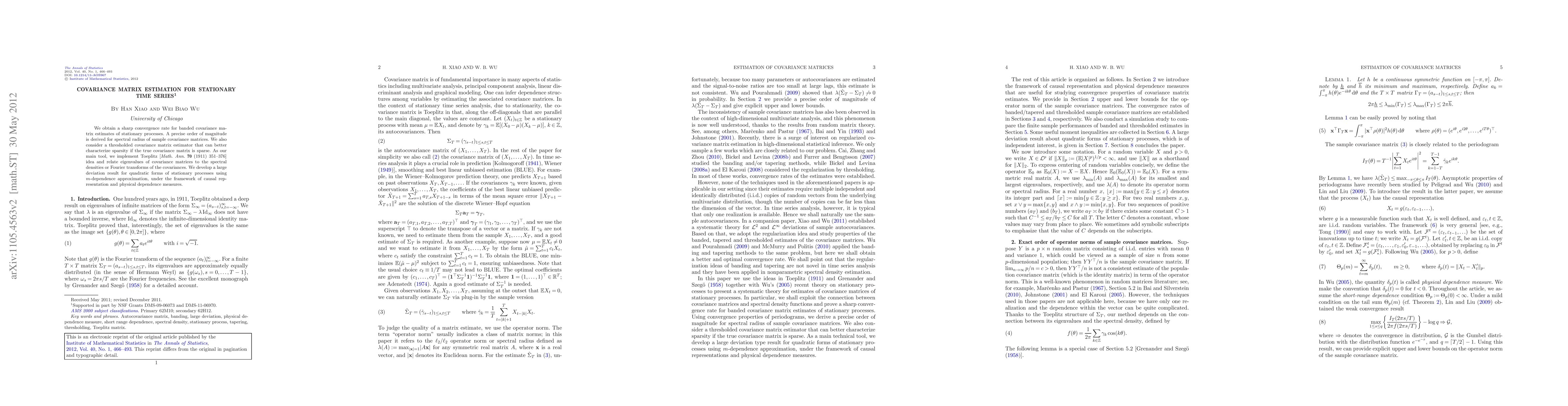 We obtain a sharp convergence rate for banded covariance matrix estimates of stationary processes. A precise order of magnitude is derived for spectral radius of sample covariance matrices. We also consider a thresholded covariance matrix estimator that can better characterize sparsity if the true covariance matrix is sparse. As our main tool, we implement Toeplitz [Math. Ann. 70 (1911) 351-376] idea and relate eigenvalues of covariance matrices to the spectral densities or Fourier transforms of the covariances. We develop a large deviation result for quadratic forms of stationary processes using m-dependence approximation, under the framework of causal representation and physical dependence measures.