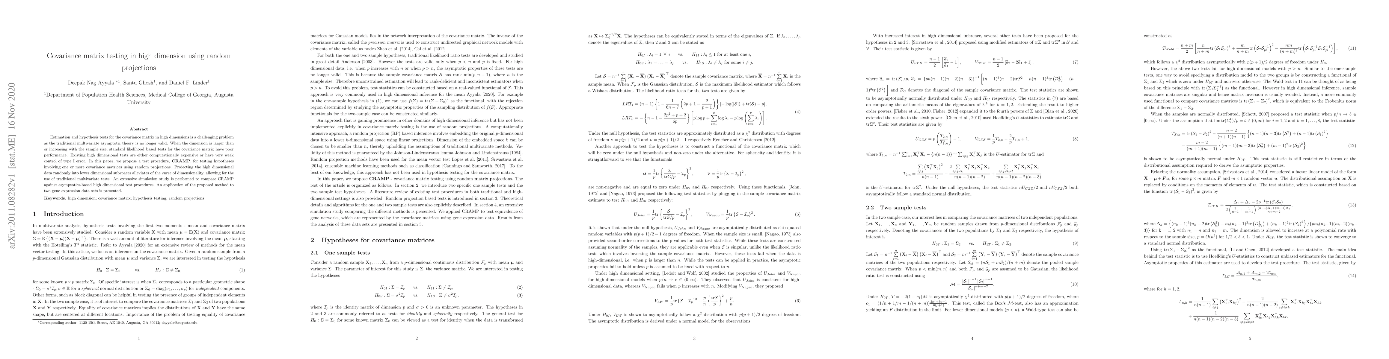 Estimation and hypothesis tests for the covariance matrix in high dimensions is a challenging problem as the traditional multivariate asymptotic theory is no longer valid. When the dimension is larger than or increasing with the sample size, standard likelihood based tests for the covariance matrix have poor performance. Existing high dimensional tests are either computationally expensive or have very weak control of type I error. In this paper, we propose a test procedure, CRAMP, for testing hypotheses involving one or more covariance matrices using random projections. Projecting the high dimensional data randomly into lower dimensional subspaces alleviates of the curse of dimensionality, allowing for the use of traditional multivariate tests. An extensive simulation study is performed to compare CRAMP against asymptotics-based high dimensional test procedures. An application of the proposed method to two gene expression data sets is presented.