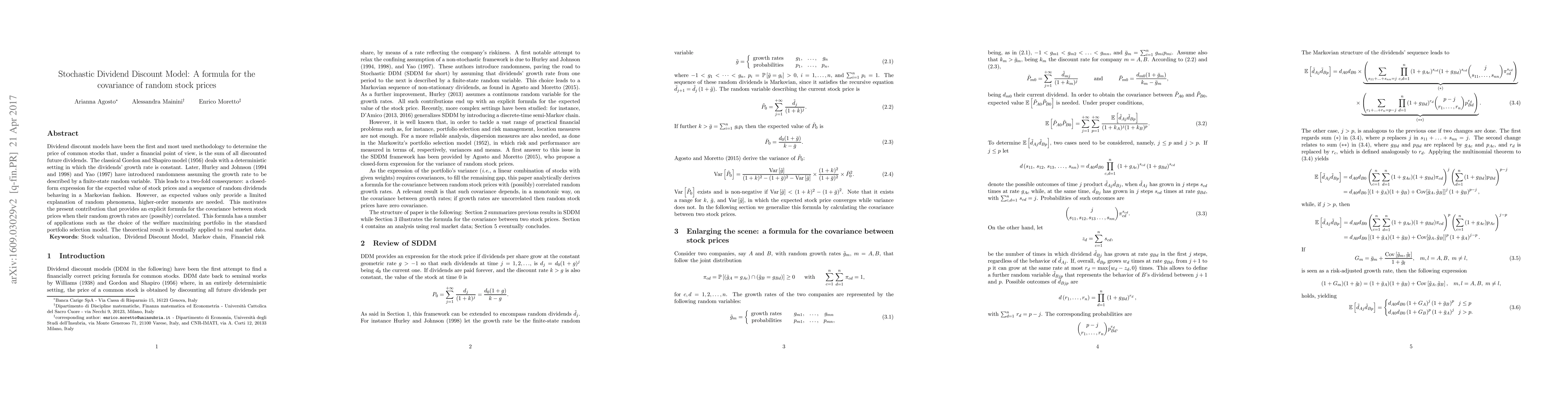 Dividend discount models have been developed in a deterministic setting. Some authors (Hurley and Johnson, 1994 and 1998; Yao, 1997) have introduced randomness in terms of stochastic growth rates, delivering closed-form expressions for the expected value of stock prices. This paper extends such previous results by determining a formula for the covariance between random stock prices when the dividends' rates of growth are correlated. The formula is eventually applied to real market data.
