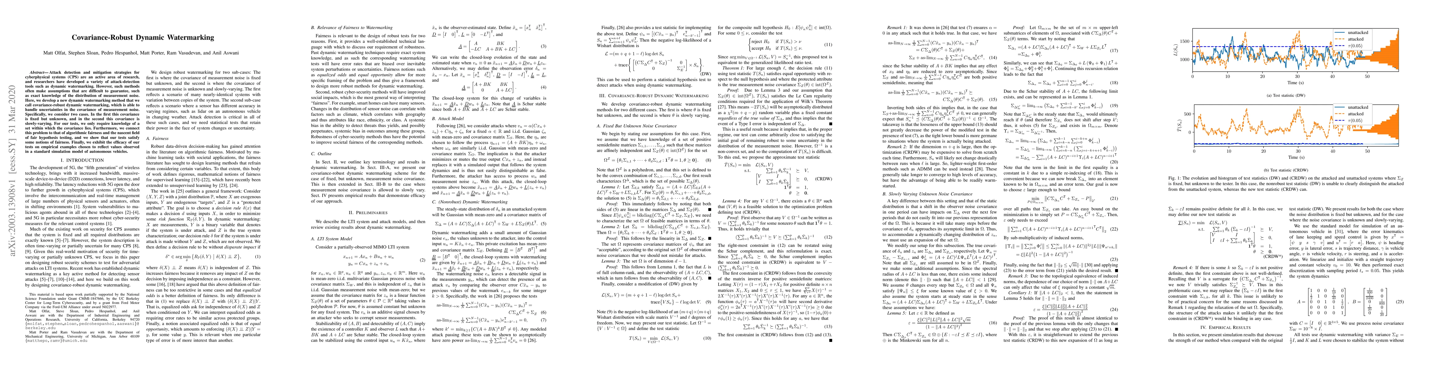 Attack detection and mitigation strategies for cyberphysical systems (CPS) are an active area of research, and researchers have developed a variety of attack-detection tools such as dynamic watermarking. However, such methods often make assumptions that are difficult to guarantee, such as exact knowledge of the distribution of measurement noise. Here, we develop a new dynamic watermarking method that we call covariance-robust dynamic watermarking, which is able to handle uncertainties in the covariance of measurement noise. Specifically, we consider two cases. In the first this covariance is fixed but unknown, and in the second this covariance is slowly-varying. For our tests, we only require knowledge of a set within which the covariance lies. Furthermore, we connect this problem to that of algorithmic fairness and the nascent field of fair hypothesis testing, and we show that our tests satisfy some notions of fairness. Finally, we exhibit the efficacy of our tests on empirical examples chosen to reflect values observed in a standard simulation model of autonomous vehicles.