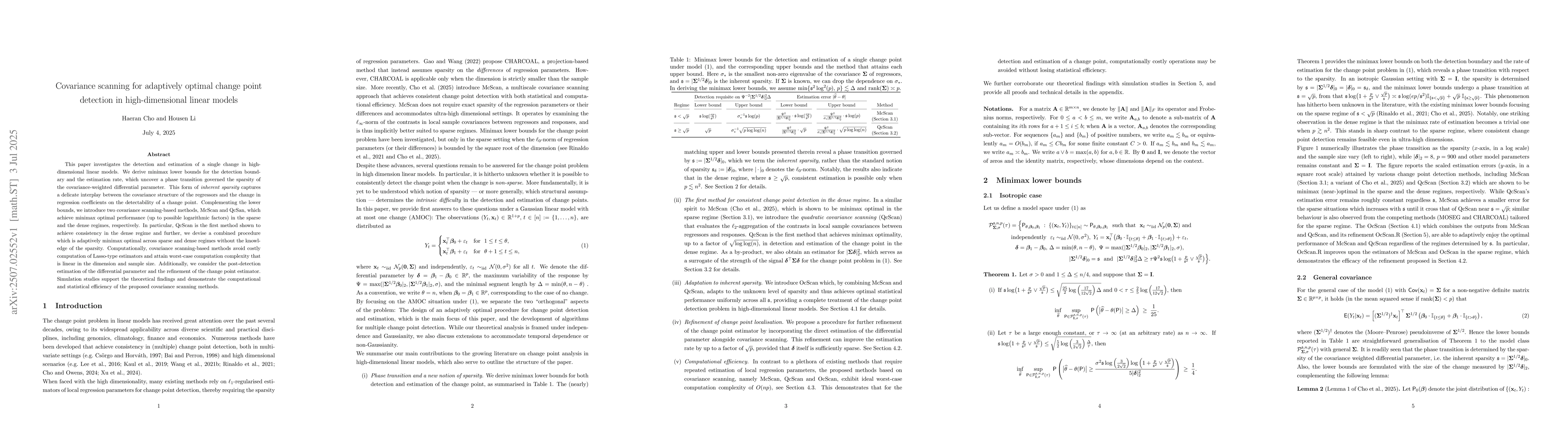 The paper introduces covariance scanning-based methods, McScan and QcScan, which achieve minimax optimal performance in detecting change points in high-dimensional linear models.