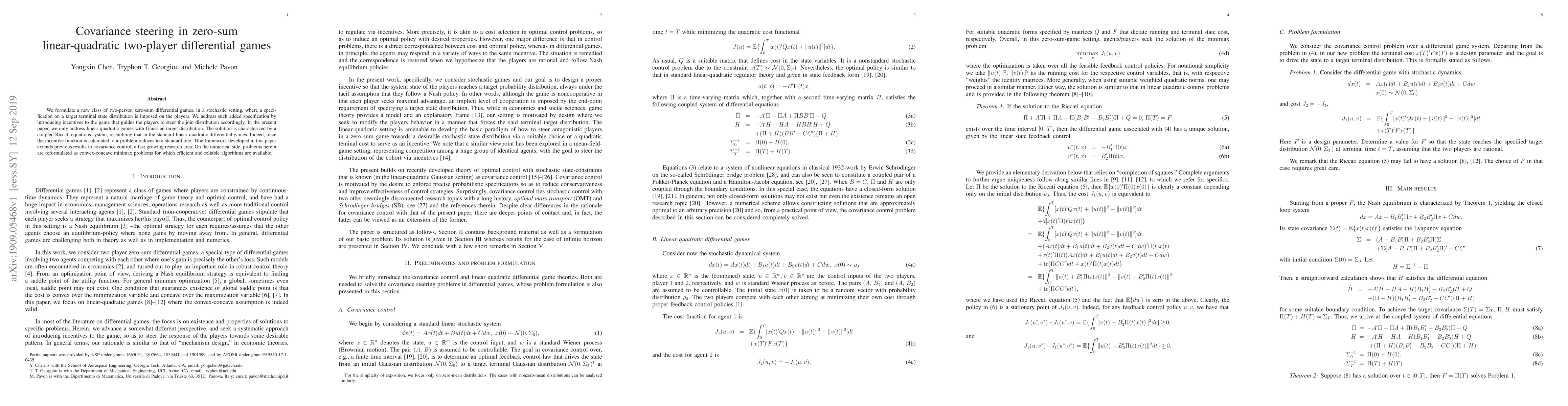 This paper introduces a new class of zero-sum differential games where players are incentivized to steer the joint state distribution towards a specified target. The solution involves a system of coupled Riccati equations, extending previous covariance control research and reformulating the problem as a convex-concave minimax optimization.