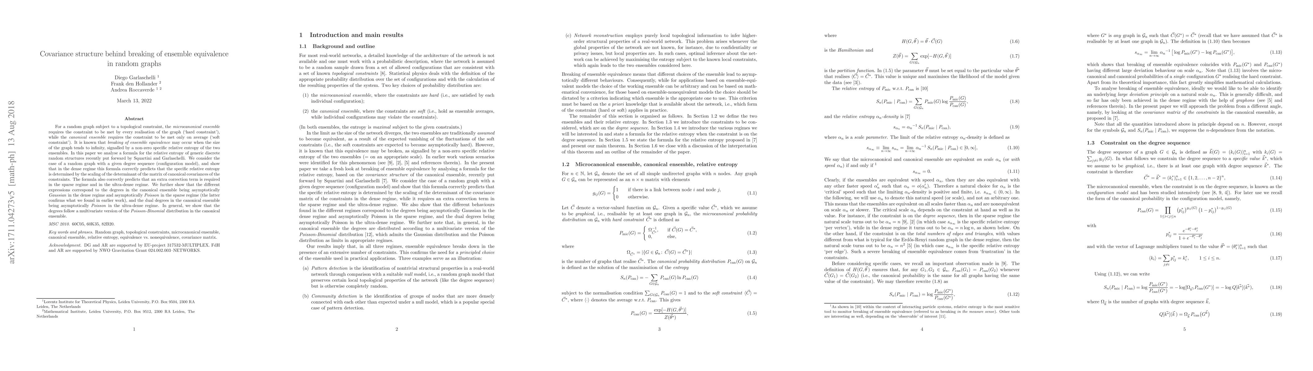This paper investigates the covariance structure behind the breaking of ensemble equivalence in random graphs under topological constraints, showing that the relative entropy between microcanonical and canonical ensembles is determined by the scaling of the determinant of the matrix of canonical covariances. It confirms that the formula proposed by Squartini and Garlaschelli accurately predicts the specific relative entropy in different regimes, with degrees following a multivariate Poisson-Binomial distribution in the canonical ensemble.