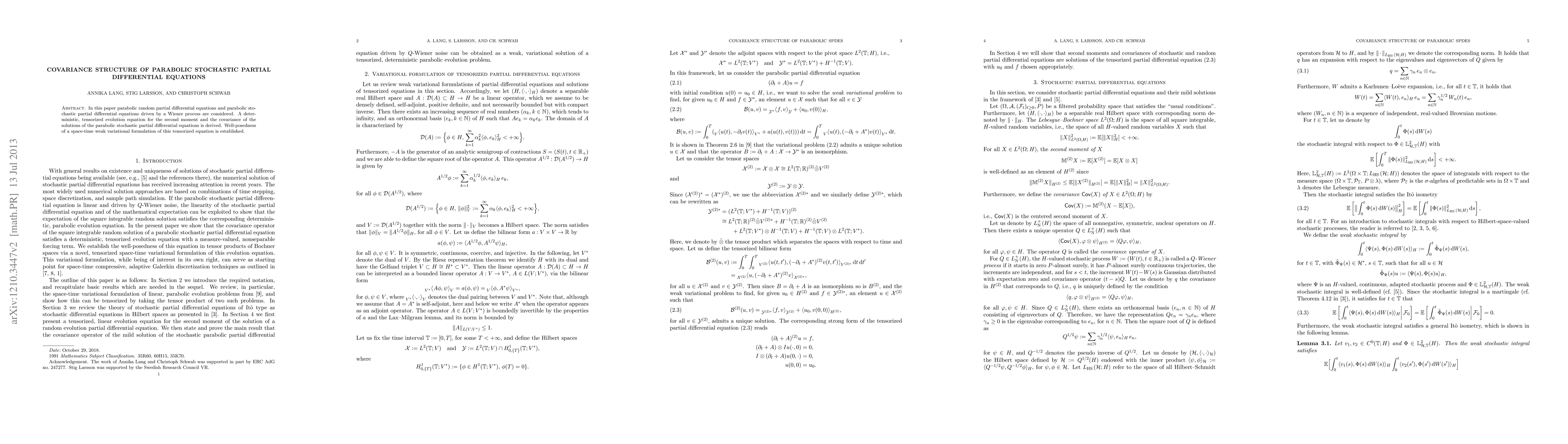 In this paper parabolic random partial differential equations and parabolic stochastic partial differential equations driven by a Wiener process are considered. A deterministic, tensorized evolution equation for the second moment and the covariance of the solutions of the parabolic stochastic partial differential equations is derived. Well-posedness of a space-time weak variational formulation of this tensorized equation is established.