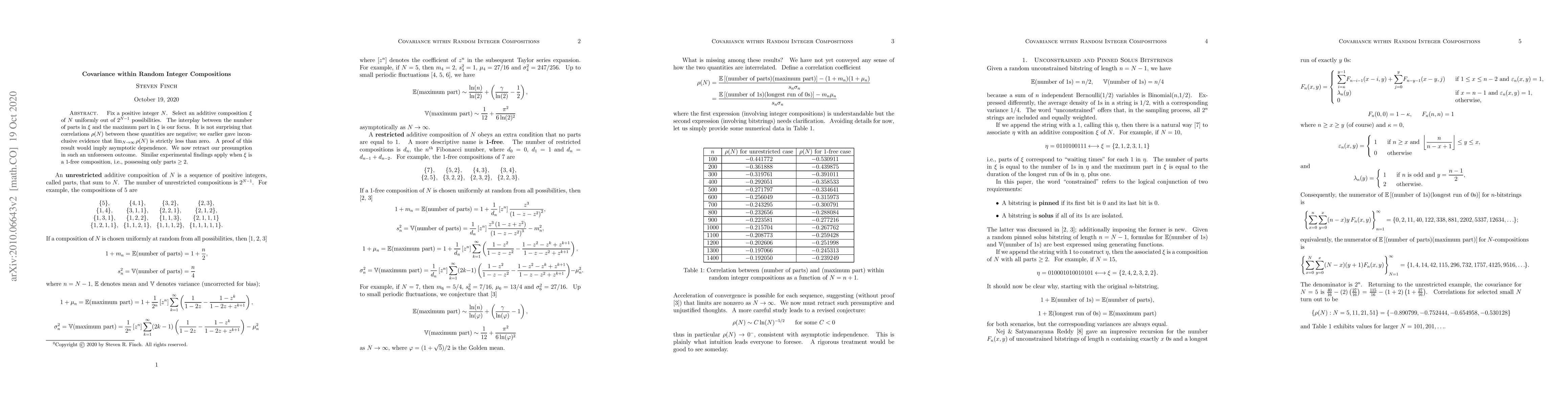 Fix a positive integer $N$. Select an additive composition $\xi$ of $N$ uniformly out of $2^{N-1}$ possibilities. The interplay between the number of parts in $\xi$ and the maximum part in $\xi$ is our focus. It is not surprising that correlations $\rho(N)$ between these quantities are negative; we earlier gave inconclusive evidence that $\lim_{N \to \infty} \rho(N)$ is strictly less than zero. A proof of this result would imply asymptotic dependence. We now retract our presumption in such an unforeseen outcome. Similar experimental findings apply when $\xi$ is a 1-free composition, i.e., possessing only parts $\geq 2$.