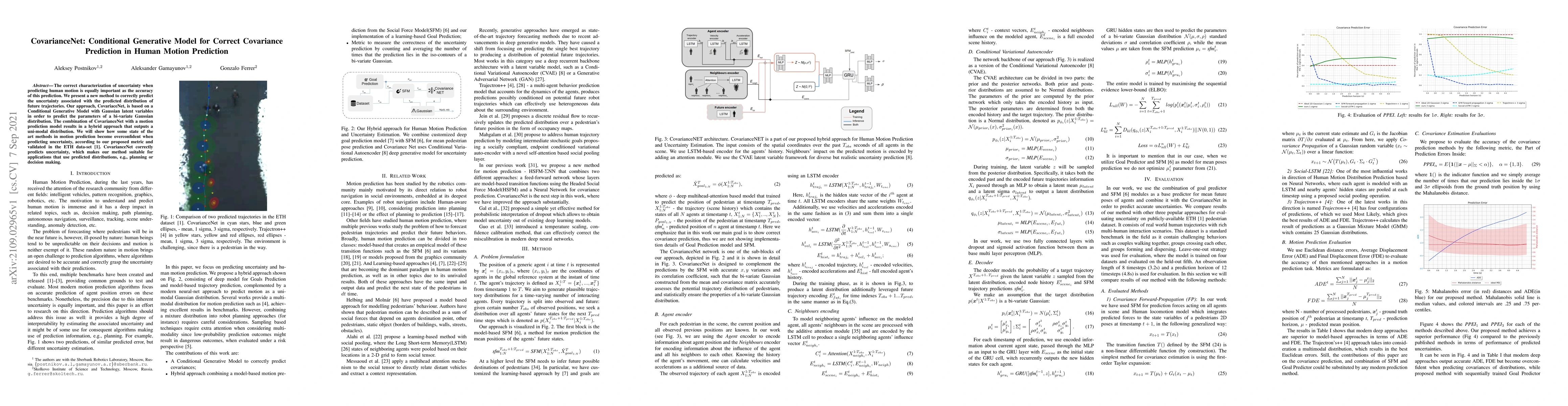 CovarianceNet predicts human motion uncertainty with a conditional generative model, offering a hybrid approach that combines motion prediction with uncertainty estimation for applications like planning and decision-making.