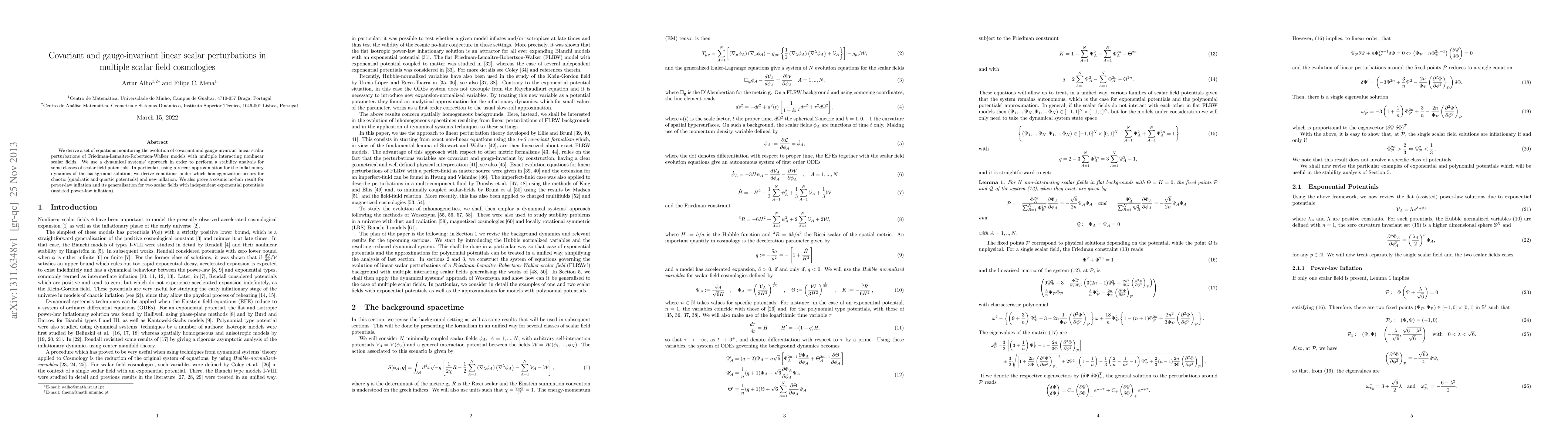 This paper derives covariant and gauge-invariant linear scalar perturbation equations for multiple interacting scalar fields in Friedman-Lemaître-Robertson-Walker cosmologies. It employs dynamical systems analysis to study stability and homogenization conditions for various scalar field potentials, including chaotic, new inflation, and power-law inflation scenarios.