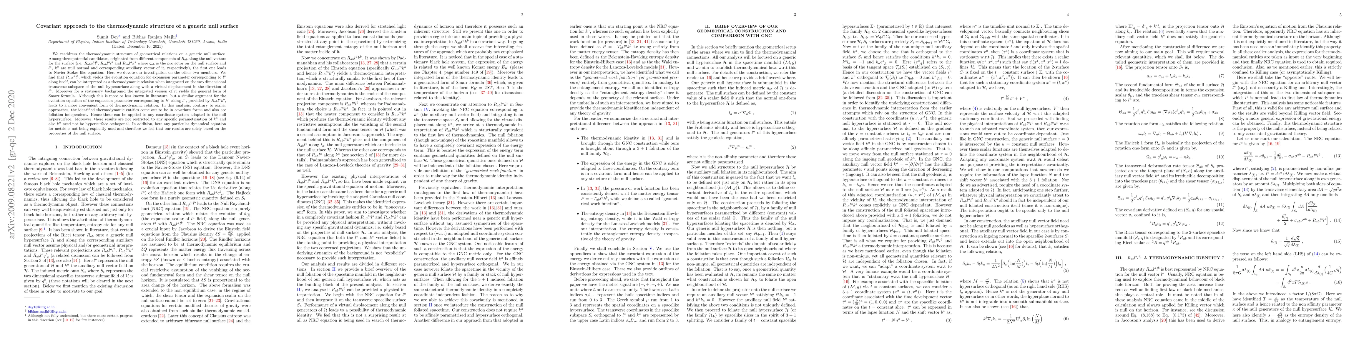 We readdress the thermodynamic structure of geometrical relations on a generic null surface. Among three potential candidates, originated from different components of $R_{ab}$ along the null vectors for the surface (i.e. $R_{ab}q^a_cl^b$, $R_{ab}l^al^b$ and $R_{ab}l^ak^b$ where $q_{ab}$ is the projector on the null surface and $l^a$, $k^a$ are null normal and corresponding auxiliary vector of it, respectively), the first one leads to Navier-Stokes like equation. Here we devote our investigation on the other two members. We find that $R_{ab}l^al^b$, which yields the evolution equation for expansion parameter corresponding to $l^a$ along itself, can be interpreted as a thermodynamic relation when integrated on the two dimensional transverse subspace of the null hypersurface along with a virtual displacement in the direction of $l^a$. Moreover for a stationary background the integrated version of it yields the general form of Smarr formula. Although this is more or less known in literature, but a similar argument for the evolution equation of the expansion parameter corresponding to $k^a$ along $l^a$, provided by $R_{ab}l^ak^b$, leads to a more convenient form of thermodynamic relation. In this analysis, contrary to earlier approaches, the identified thermodynamic entities come out to be in covariant forms and also are foliation independent. Hence these can be applied to any coordinate system adapted to the null hypersurface. Moreover, these results are not restricted to any specific parametrisation of $k^a$ and also $k^a$ need not be hypersurface orthogonal. In addition, here any particular dynamical equation for metric is not being explicitly used and therefore we feel that our results are solely based on the properties of the null surface.