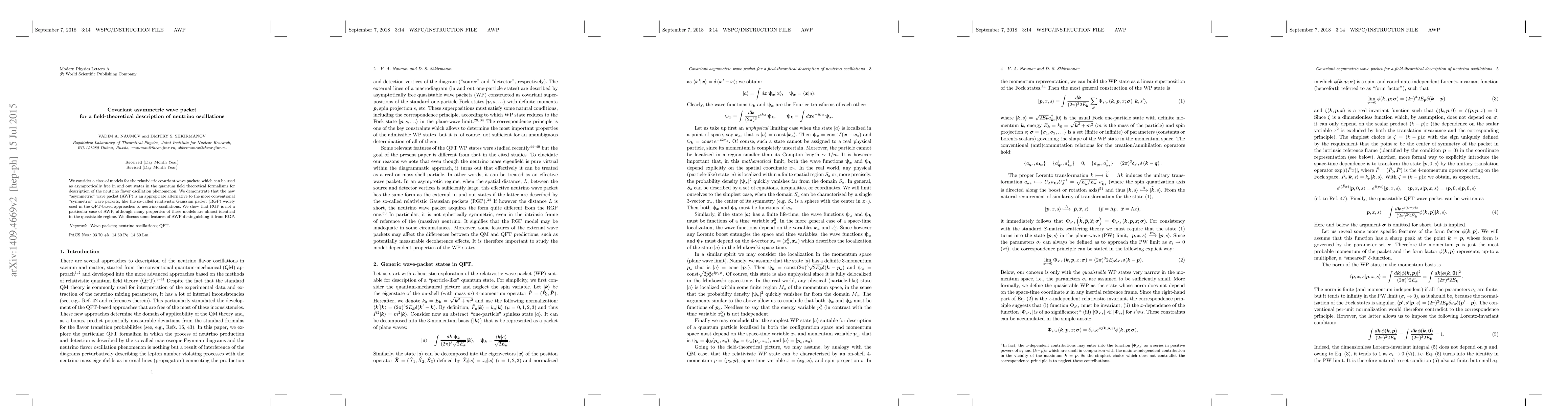 We consider a class of models for the relativistic covariant wave packets which can be used as asymptotically free in and out states in the quantum field theoretical formalisms for description of the neutrino flavor oscillation phenomenon. We demonstrate that the new "asymmetric" wave packet (AWP) is an appropriate alternative for the more convenient "symmetric" wave packets, like the so-called relativistic Gaussian packet (RGP) widely used in the QFT-based approaches to neutrino oscillations. We show that RGP is not a particular case of AWP, although many properties of these models are almost identical in the quasistable regime. We discuss some features of AWP distinguishing it from RGP.