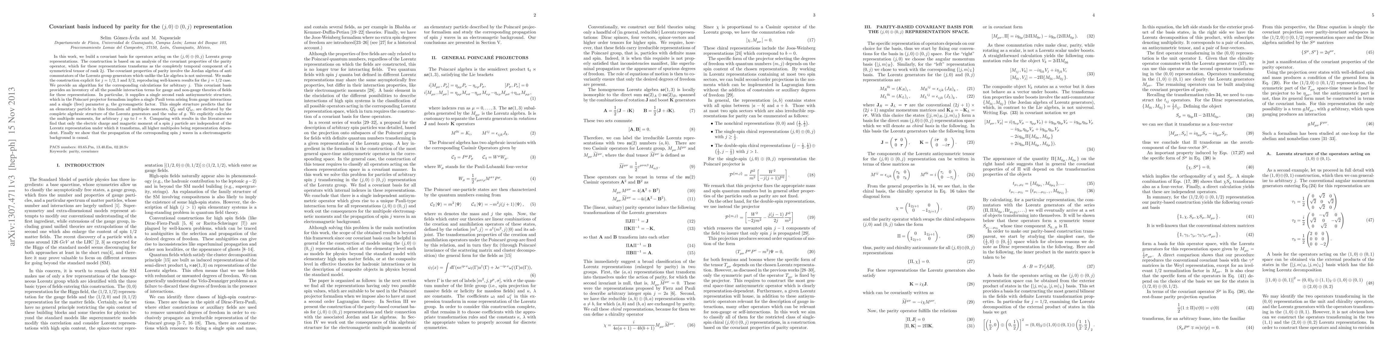 In this work, we build a covariant basis for operators acting on the $(j,0)\oplus(0,j)$ Lorentz group representations. The construction is based on an analysis of the covariant properties of the parity operator, which for these representations transforms as the completely temporal component of a symmetrical tensor of rank $2j$. The covariant properties of parity involve the Jordan algebra of anti commutators of the Lorentz group generators which unlike the Lie algebra is not universal. We make the construction explicit for $j=1/2,1$ and $3/2$, reproducing well-known results for the $j=1/2$ case. We provide an algorithm for the corresponding calculations for arbitrary $j$. This covariant basis provides an inventory of all the possible interaction terms for gauge and non-gauge theories of fields for these representations. In particular, it supplies a single second rank antisymmetric structure, which in the Poincar\'e projector formalism implies a single Pauli term arising from gauge interactions and a single (free) parameter $g$, the gyromagnetic factor. This simple structure predicts that for an elementary particle in this formalism all multipole moments, $Q^{l}_{E}$ and $Q^{l}_{M}$, are dictated by the complete algebraic structure of the Lorentz generators and the value of $g$. We explicitly calculate the multipole moments, for arbitrary $j$ up to $l=8$. Comparing with results in the literature we find that only the electric charge and magnetic moment of a spin $j$ particle are independent of the Lorentz representation under which it transforms, all higher multipoles being representation dependent. Finally we show that the propagation of the corresponding spin $j$ waves in a electromagnetic background is causal.