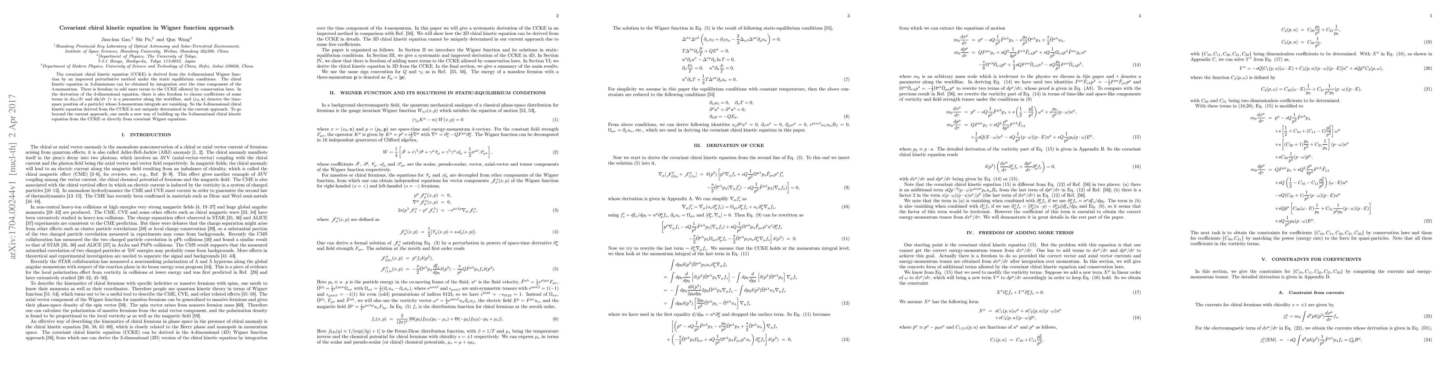 The covariant chiral kinetic equation (CCKE) is derived from the 4-dimensional Wigner function by an improved perturbative method under the static equilibrium conditions. The chiral kinetic equation in 3-dimensions can be obtained by intergation over the time component of the 4-momentum. There is freedom to add more terms to the CCKE allowed by conservation laws. In the derivation of the 3-dimensional equation, there is also freedom to choose coefficients of some terms in $dx_{0}/d\tau$ and $d\mathbf{x}/d\tau$ ($\tau$ is a parameter along the worldline, and $(x_{0},\mathbf{x})$ denotes the time-space position of a particle) whose 3-mometum integrals are vanishing. So the 3-dimensional chiral kinetic equation derived from the CCKE is not uniquely determined in the current approach. To go beyond the current approach, one needs a new way of building up the 3-dimensional chiral kinetic equation from the CCKE or directly from covariant Wigner equations.