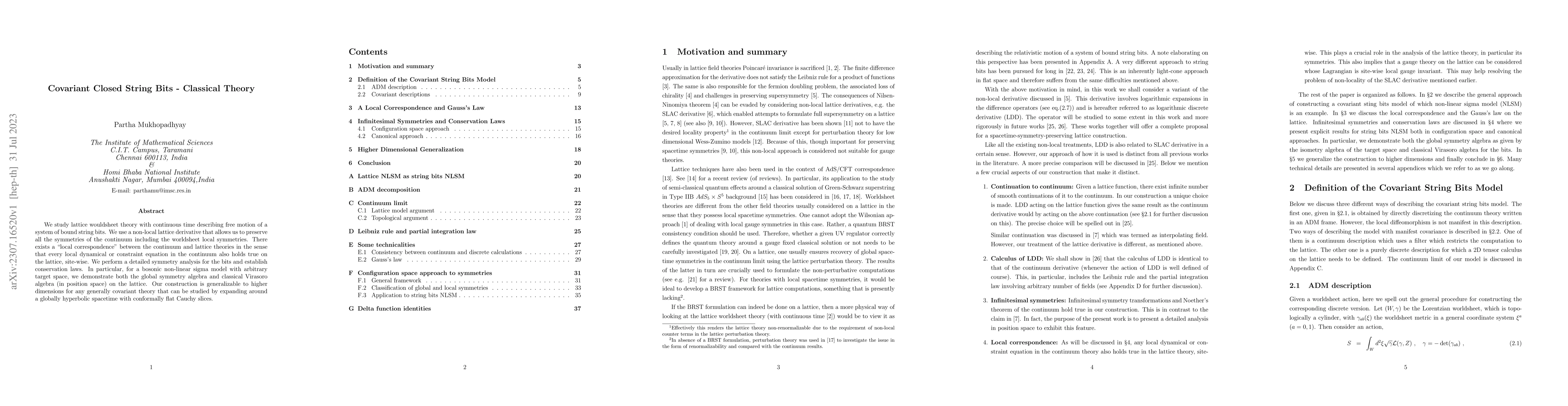 We study lattice wouldsheet theory with continuous time describing free motion of a system of bound string bits. We use a non-local lattice derivative that allows us to preserve all the symmetries of the continuum including the worldsheet local symmetries. There exists a ``local correspondence'' between the continuum and lattice theories in the sense that every local dynamical or constraint equation in the continuum also holds true on the lattice, site-wise. We perform a detailed symmetry analysis for the bits and establish conservation laws. In particular, for a bosonic non-linear sigma model with arbitrary target space, we demonstrate both the global symmetry algebra and classical Virasoro algebra (in position space) on the lattice. Our construction is generalizable to higher dimensions for any generally covariant theory that can be studied by expanding around a globally hyperbolic spacetime with conformally flat Cauchy slices.
