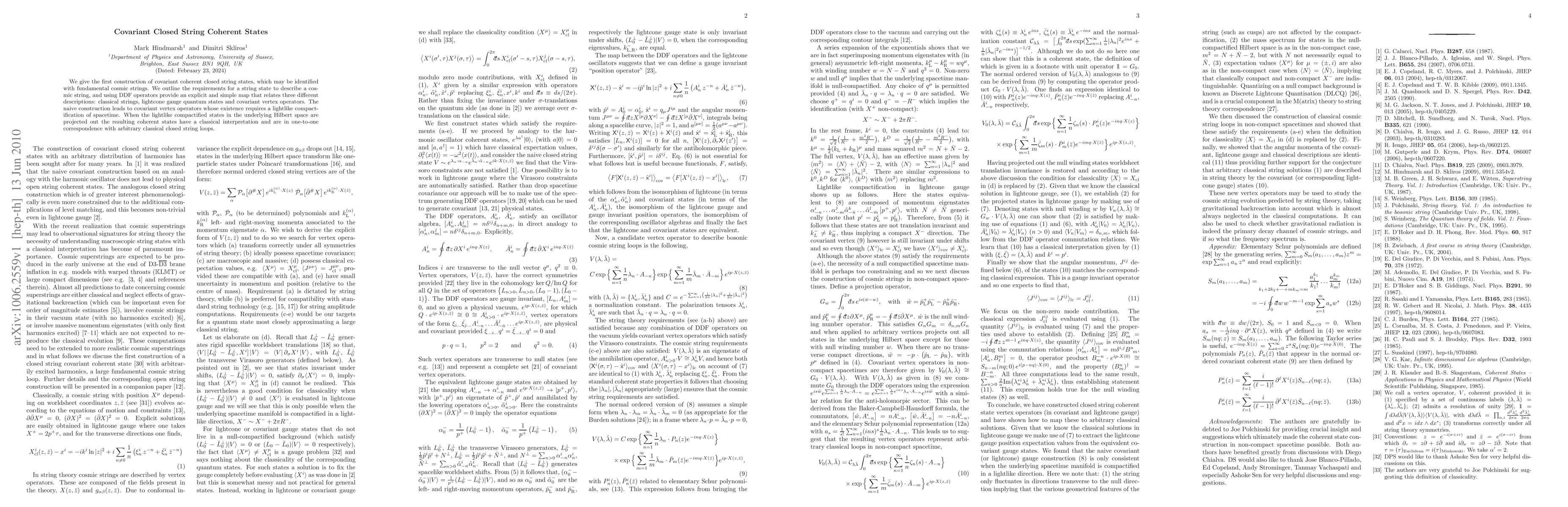 This paper constructs covariant coherent states for closed strings, identifying them with fundamental cosmic strings, and provides a clear mapping between classical strings, quantum states, and covariant vertex operators using DDF operators. The resulting coherent states, free of lightlike compactified states, correspond to arbitrary classical closed string loops.