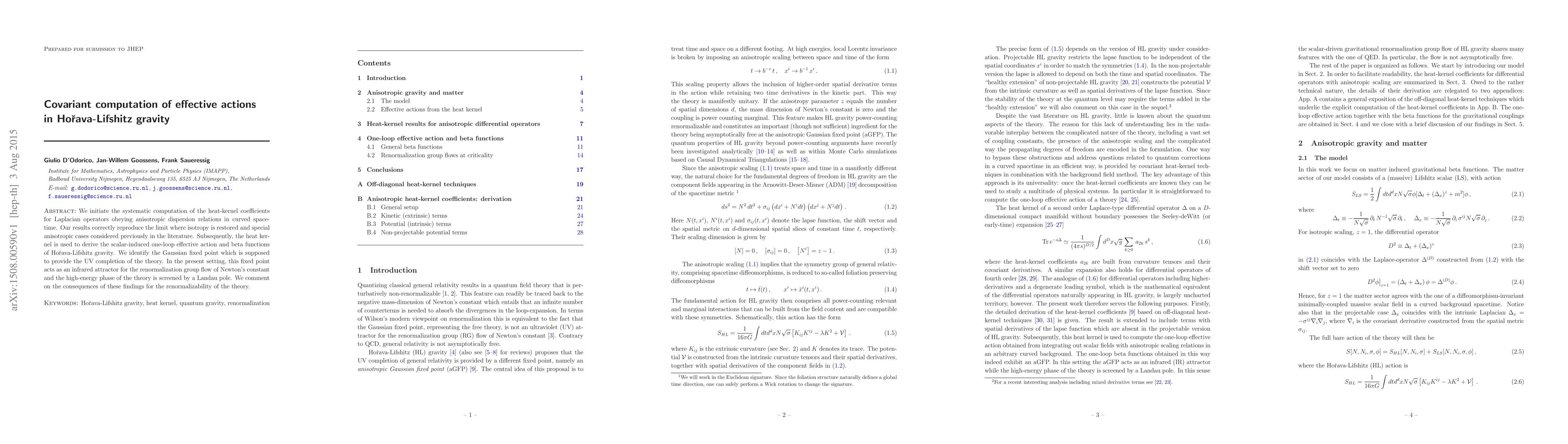 This paper systematically computes heat-kernel coefficients for Laplacian operators in Horava-Lifshitz gravity, deriving the scalar-induced one-loop effective action and identifying a Gaussian fixed point. The fixed point serves as an infrared attractor, indicating the theory's UV completion, though it is accompanied by a Landau pole screening the high-energy phase.