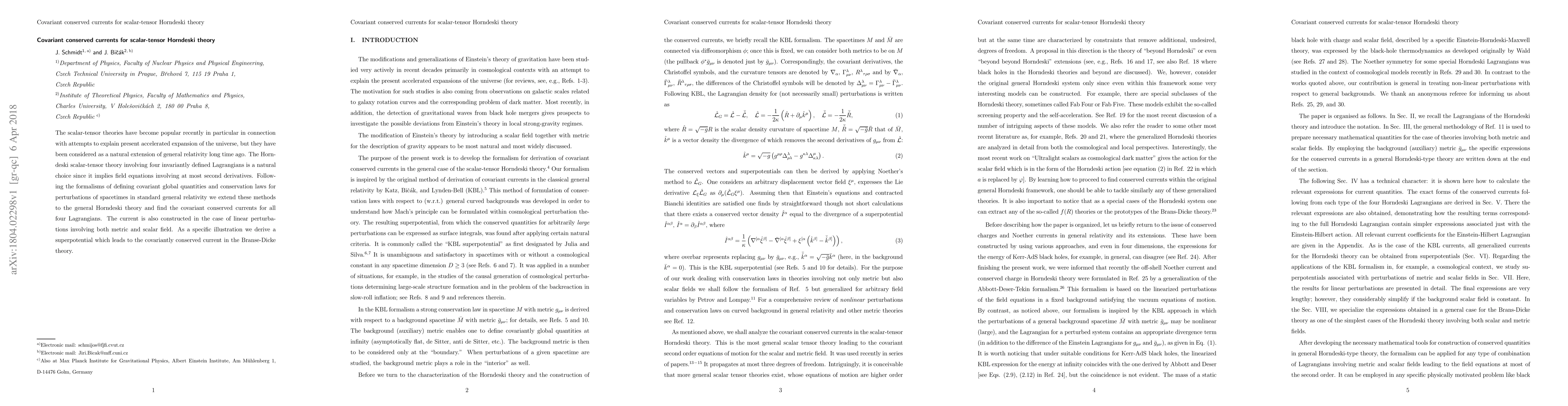 This paper extends the formalism of defining covariant conserved currents to the Horndeski scalar-tensor theory, finding conserved currents for all four Lagrangians and illustrating the method with the Branse-Dicke theory. The study also constructs a superpotential for linear perturbations involving both metric and scalar field.