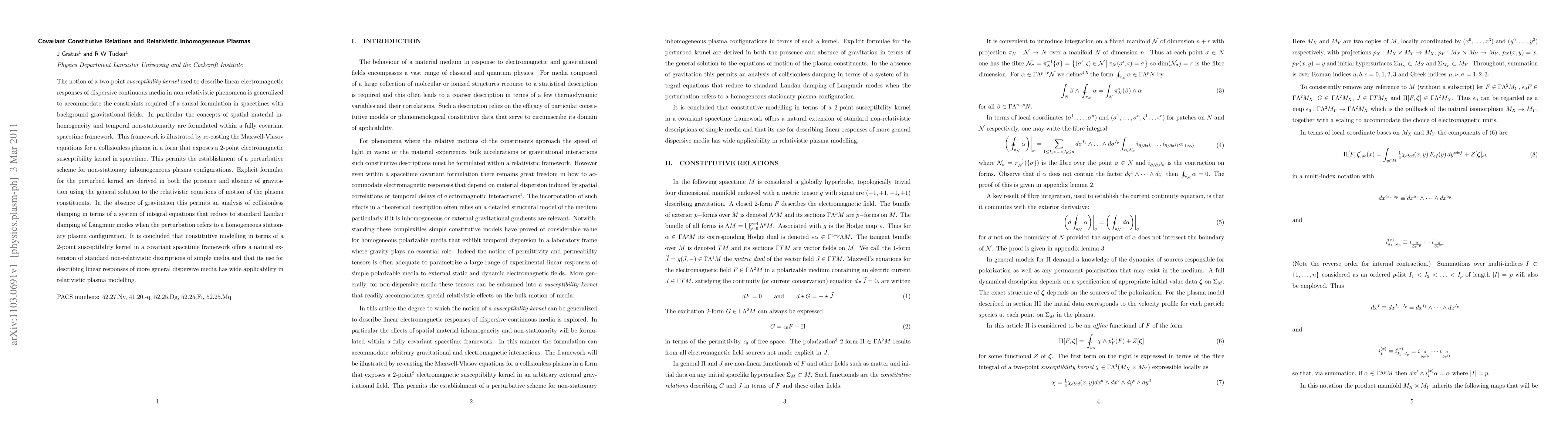 The notion of a two-point susceptibility kernel used to describe linear electromagnetic responses of dispersive continuous media in non-relativistic phenomena is generalized to accommodate the constraints required of a causal formulation in spacetimes with background gravitational fields. In particular the concepts of spatial material inhomogeneity and temporal non-stationarity are formulated within a fully covariant spacetime framework. This framework is illustrated by re-casting the Maxwell-Vlasov equations for a collisionless plasma in a form that exposes a 2-point electromagnetic susceptibility kernel in spacetime. This permits the establishment of a perturbative scheme for non-stationary inhomogeneous plasma configurations. Explicit formulae for the perturbed kernel are derived in both the presence and absence of gravitation using the general solution to the relativistic equations of motion of the plasma constituents. In the absence of gravitation this permits an analysis of collisionless damping in terms of a system of integral equations that reduce to standard Landau damping of Langmuir modes when the perturbation refers to a homogeneous stationary plasma configuration. It is concluded that constitutive modelling in terms of a 2-point susceptibility kernel in a covariant spacetime framework offers a natural extension of standard non-relativistic descriptions of simple media and that its use for describing linear responses of more general dispersive media has wide applicability in relativistic plasma modelling.