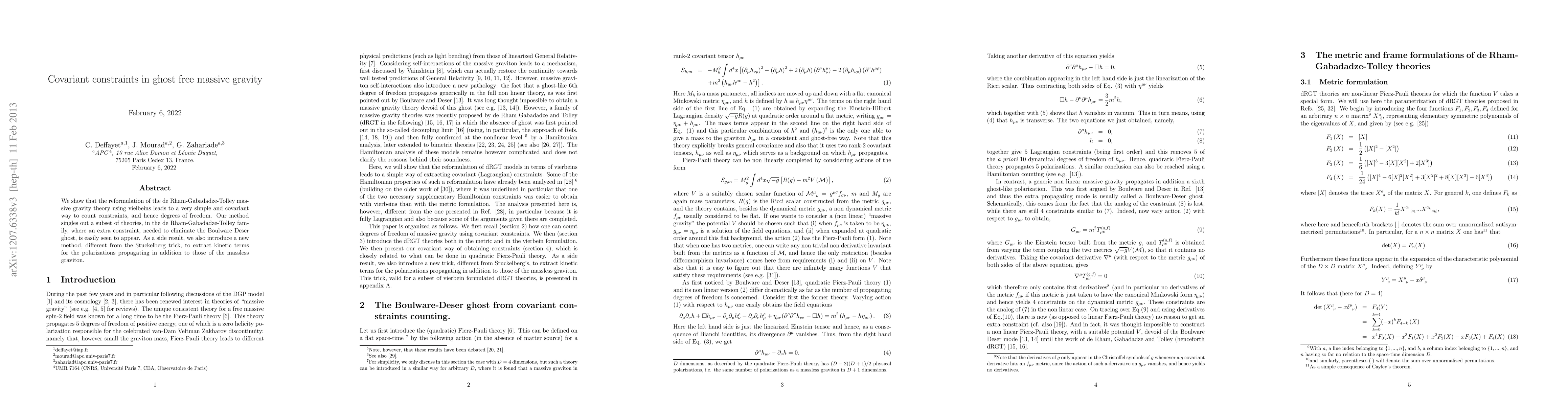 We show that the reformulation of the de Rham-Gabadadze-Tolley massive gravity theory using vielbeins leads to a very simple and covariant way to count constraints, and hence degrees of freedom. Our method singles out a subset of theories, in the de Rham-Gabadadze-Tolley family, where an extra constraint, needed to eliminate the Boulware Deser ghost, is easily seen to appear. As a side result, we also introduce a new method, different from the Stuckelberg trick, to extract kinetic terms for the polarizations propagating in addition to those of the massless graviton.
