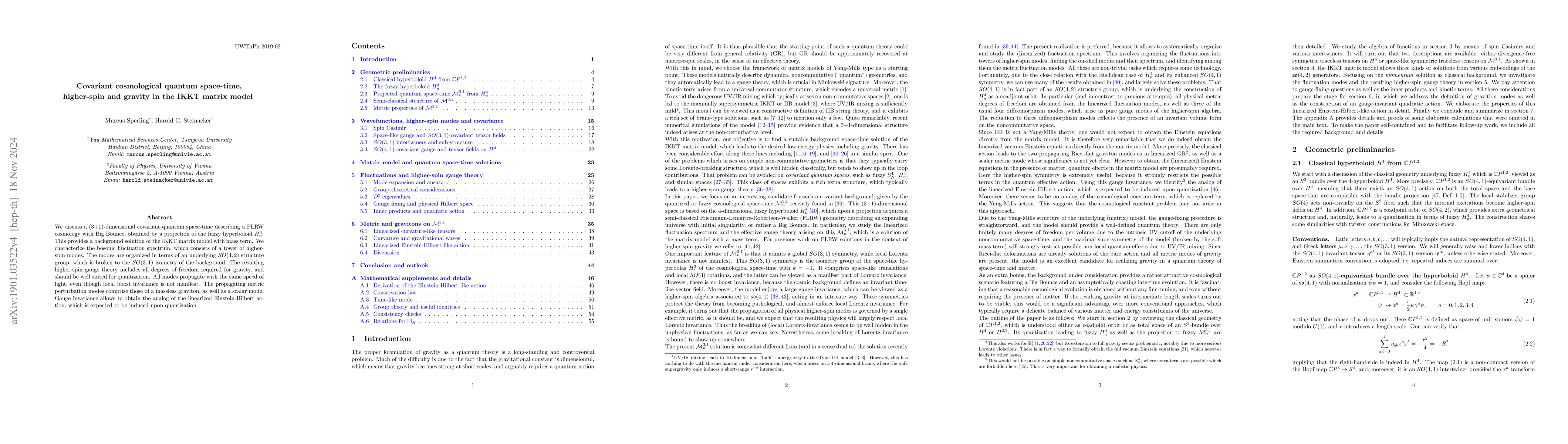 This paper presents a covariant quantum space-time model for a FLRW cosmology with a Big Bounce, derived from the IKKT matrix model, featuring a spectrum of higher-spin modes. The model includes a linearized Einstein-Hilbert action, suggesting it is suitable for quantization and includes all necessary degrees of freedom for gravity.