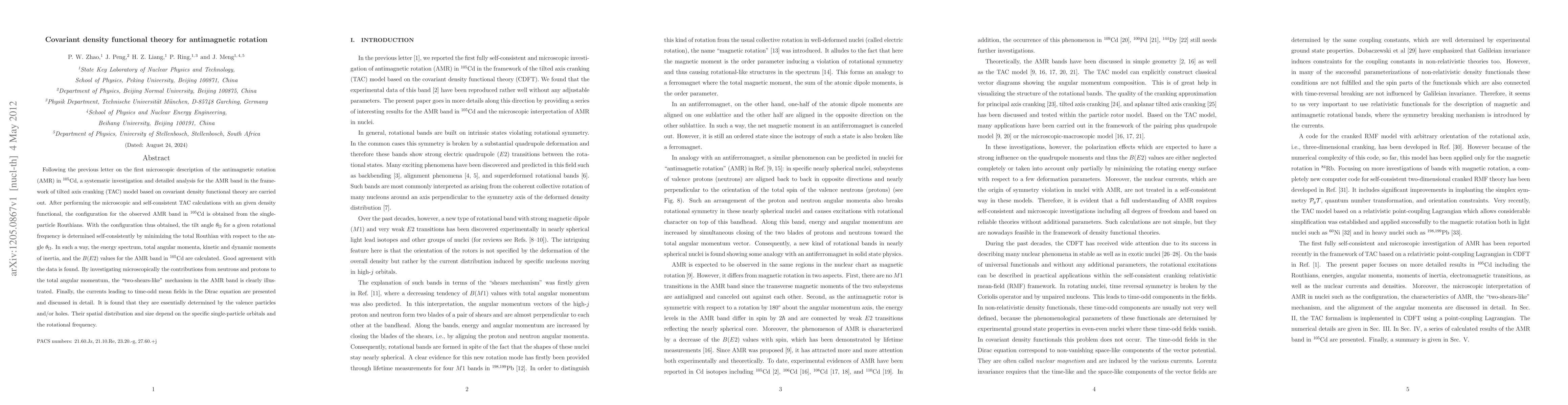 Following the previous letter on the first microscopic description of the antimagnetic rotation (AMR) in 105Cd, a systematic investigation and detailed analysis for the AMR band in the frame-work of tilted axis cranking (TAC) model based on covariant density functional theory are carried out. After performing the microscopic and self-consistentTAC calculations with an given density functional, the configuration for the observed AMR band in 105Cd is obtained from the single-particle Routhians. With the configuration thus obtained, the tilt angle for a given rotational frequency is determined self-consistently by minimizing the total Routhian with respect to the tilt angle. In such a way, the energy spectrum, total angular momenta, kinetic and dynamic moments of inertia, and the B(E2) values for the AMR band in 105Cd are calculated. Good agreement with the data is found. By investigating microscopically the contributions from neutrons and protons to the total angular momentum, the "two-shears-like" mechanism in the AMR band is clearly illus-trated. Finally, the currents leading to time-odd mean fields in the Dirac equation are presented and discussed in detail. It is found that they are essentially determined by the valence particles and/or holes. Their spatial distribution and size depend onthe specific single-particle orbitals and the rotational frequency.