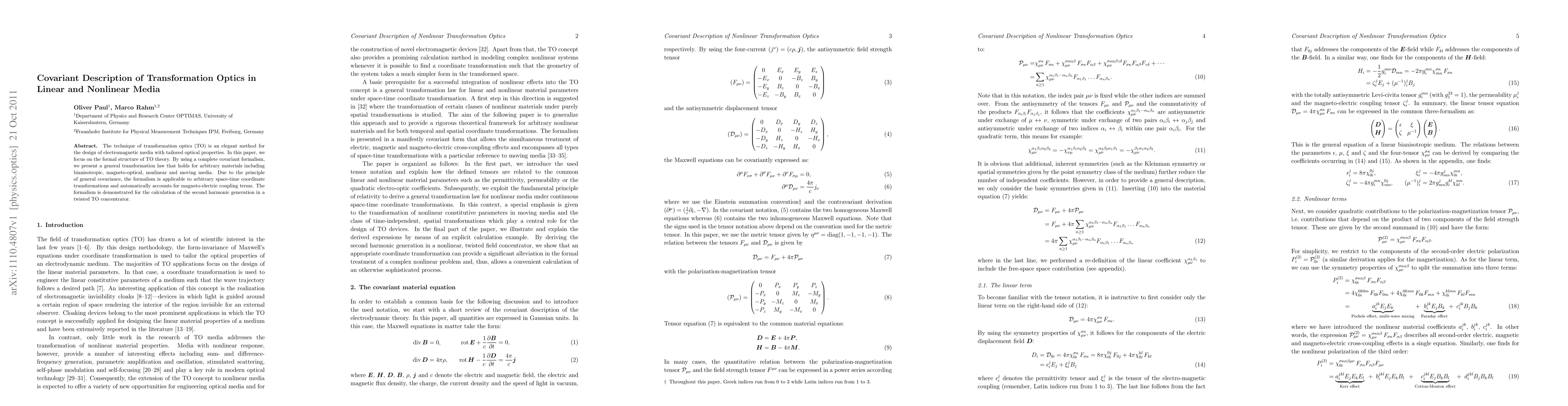 This paper develops a covariant formalism for transformation optics applicable to linear and nonlinear media, including bianisotropic and magneto-optical materials. It demonstrates the formalism's utility through the calculation of second harmonic generation in a twisted transformation optics concentrator.